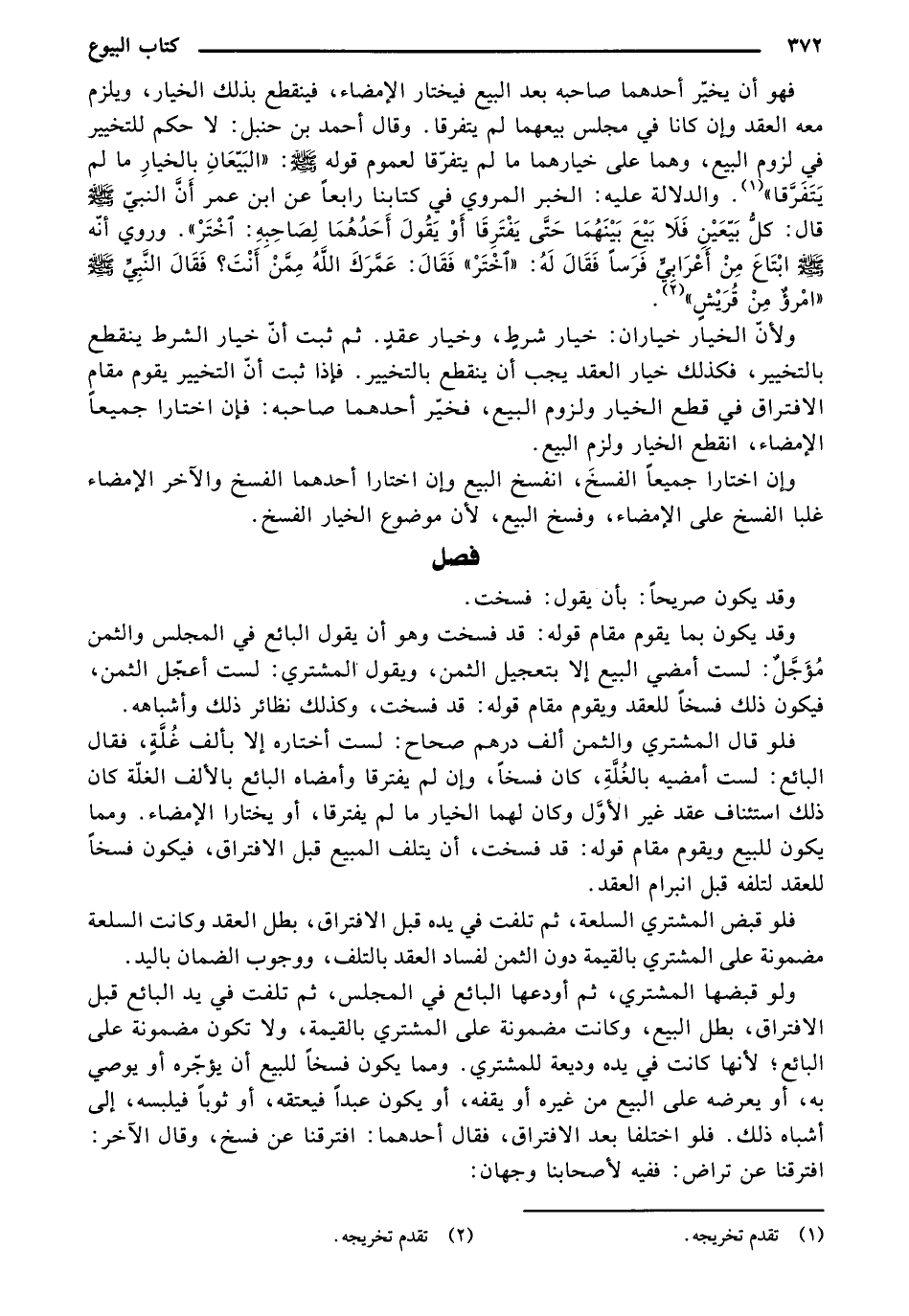 وقد يكون بما يقوم مقام قوله: قد فسخت وهو أن يقول البائع في المجلس والثمن مؤجل: لست أمضي البيع إلا بتعجيل الثمن، ويقول المشتري: لست أعجل الثمن، فيكون ذلك فسخاً للعقد ويقوم مقام قوله: قد فسخت، وكذلك نظائر ذلك وأشباهه.