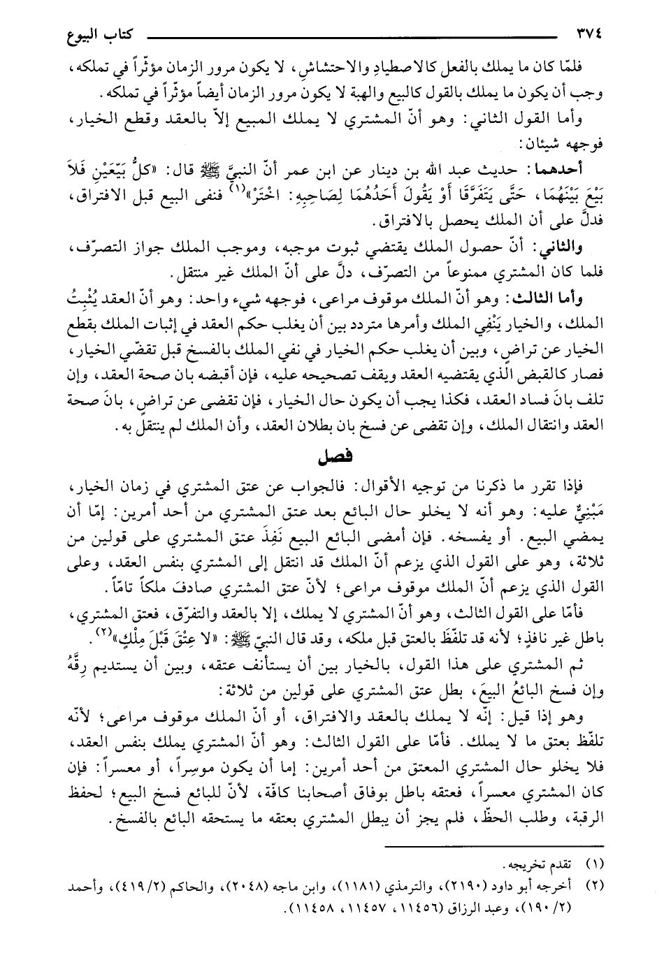 وأما الثالث: وهو أن الملك موقوف مراعى، فوجهه شيء واحد: وهو أن العقد يثبت الملك، والخيار ينفي الملك وأمرها متردد بين أن يغلب حكم العقد في إثبات الملك بقطع الخيار عن تراض، وبين أن يغلب حكم الخيار في نفي الملك بالفسخ قبل تقضي الخيار، فصار كالقبض الذي يقتضيه العقد ويقف تصحيحه عليه، فإن أقبضه بان صحة العقد، وإن تلف بان فساد العقد، فكذا يجب أن يكون حال الخيار، فإن تقضى عن تراض، بان صحة العقد وانتقال الملك، وإن تقضى عن فسخ بان بطلان العقد، وأن الملك لم ينتقل به.