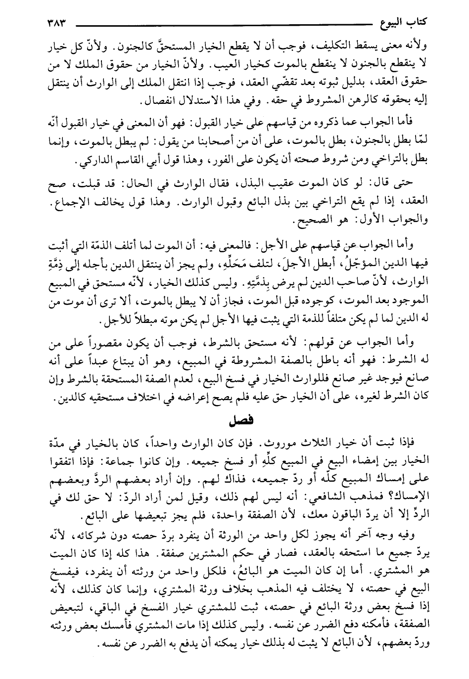 وأما الجواب عن قياسهم على الأجل: فالمعنى فيه: أن الموت لما أتلف الذمة التي أثبت فيها الدين المؤجل، أبطل الأجل، لتلف محله، ولم يجز أن ينتقل الدين بأجله إلى ذمة الوارث، لأن صاحب الدين لم يرض بذمته. وليس كذلك الخيار، لأنه مستحق في المبيع الموجود بعد الموت، كوجوده قبل الموت، فجاز أن لا يبطل بالموت، ألا ترى أن موت من له الدين لما لم يكن متلفاً للذمة التي يثبت فيها الأجل لم يكن موته مبطلاً للأجل.