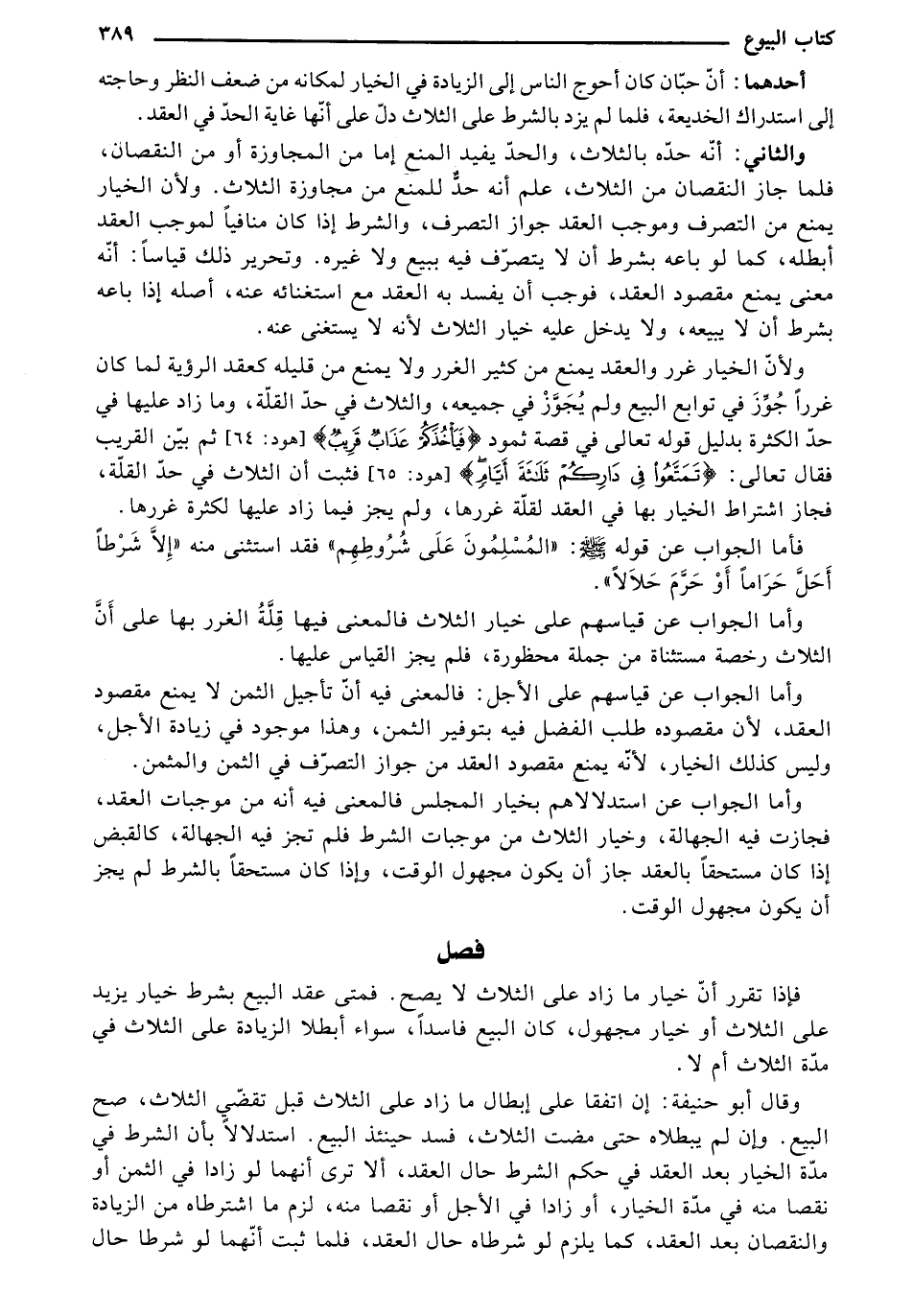 والثاني: أنه حده بالثلاث، والحد يفيد المنع إما من المجاوزة أو من النقصان، فلما جاز النقصان من الثلاث، علم أنه حد للمنع من مجاوزة الثلاث. ولأن الخيار يمنع من التصرف وموجب العقد جواز التصرف، والشرط إذا كان منافياً لموجب العقد أبطله، كما لو باعه بشرط أن لا يتصرف فيه ببيع ولا غيره. وتحرير ذلك قياساً: أنه معنى يمنع مقصود العقد، فوجب أن يفسد به العقد مع استغنائه عنه، أصله إذا باعه بشرط أن لا يبيعه، ولا يدخل عليه خيار الثلاث لأنه لا يستغنى عنه.