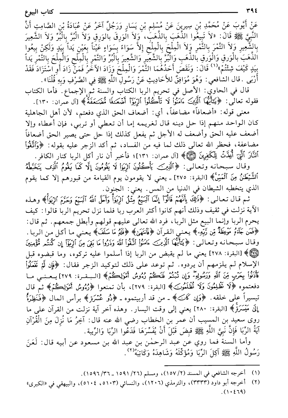 قال في الحاوي: الأصل في تحريم الربا بالكتاب والسنة ثم الإجماع. فأما الكتاب فقوله تعالى: {يَا أَيُّهَا الَّذِينَ آمَنُوا لا تَاكُلُوا الرِّبَا أَضْعَافاً مُضَاعَفَةً} [آل عمران:130].