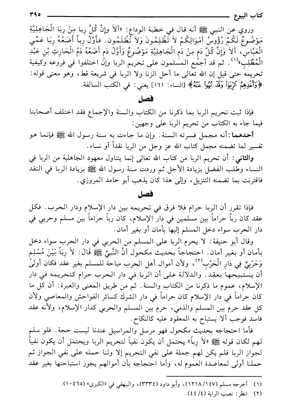 وروي عن النبي - صلى الله عليه وسلم - أنه قال في خطبة الوداع: "ألا وإن كل ربا من ربا الجاهلية موضوع لكم رؤوس أموالكم لا تظلمون ولا تظلمون. فأول ربا أضعه ربا عمي العباس، ألا وإن كل دم من دم الجاهلية موضوع وأول دم أضعه دم الحارث بن عبد المطلب". ثم قد اجمع المسلمون على تحريم الربا وإن اختلفوا في فروعه وكيفية تحريمه حتى قيل إن الله تعالى ما أحل الزنا ولا الربا في شريعة قط، وهو معنى قوله: {وَأَخْذِهِمْ الرِّبَا وَقَدْ نُهُوا عَنْهُ} [النساء:161] يعني: في الكتب السالفة.