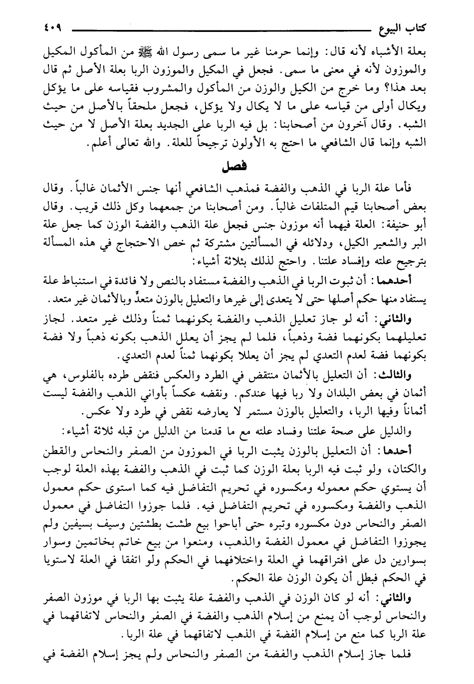 والثالث: أن التعليل بالأثمان منتقض في الطرد والعكس فنقض طرده بالفلوس، هي أثمان في بعض البلدان ولا ربا فيها عندكم. ونقضه عكساً بأواني الذهب والفضة ليست أثماناً وفيها الربا، والتعليل بالوزن مستمر لا يعارضه نقض في طرد ولاعكس.