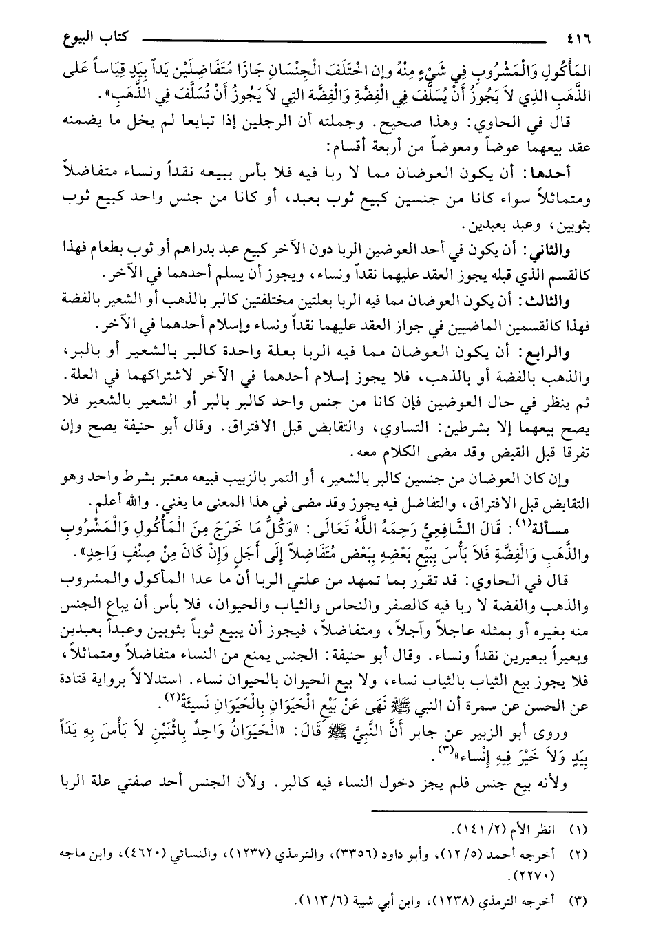 والرابع: أن يكون العوضان مما فيه الربا بعلة واحدة كالبر بالشعير أو بالبر، والذهب بالفضة أو بالذهب، فلا يجوز إسلام أحدهما في الآخر لاشتراكهما في العلة. ثم ينظر في حال العوضين فإن كانا من جنس واحد كالبر بالبر أو الشعير بالشعير فلا يصح بيعهما إلا بشرطين: التساوي، والتقابض قبل الافتراق. وقال أبو حنيفة يصح وإن تفرقا قبل القبض وقد مضى الكلام معه.