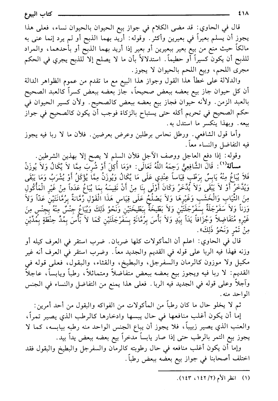 قال في الحاوي: اعلم أن المأكولات كلها ضربان. ضرب استقر في العرف كيله أو وزنه فهذا فيه الربا على قوله في القديم والجديد معاً. وضرب استقر في العرف أنه غير مكيل ولا موزون كالرمان والسفرجل، والبطيخ، والقثاء، والبقول، فعلى قوله في القديم: لا ربا فيه ويجوز بيع بعضه ببعض متفاضلاً ومتماثلاً، رطباً ويابساً، عاجلاً وآجلاً وعلى قوله في الجديد فيه الربا. فعلى هذا يمنع من التفاضل والنساء في الجنس الواحد منه.