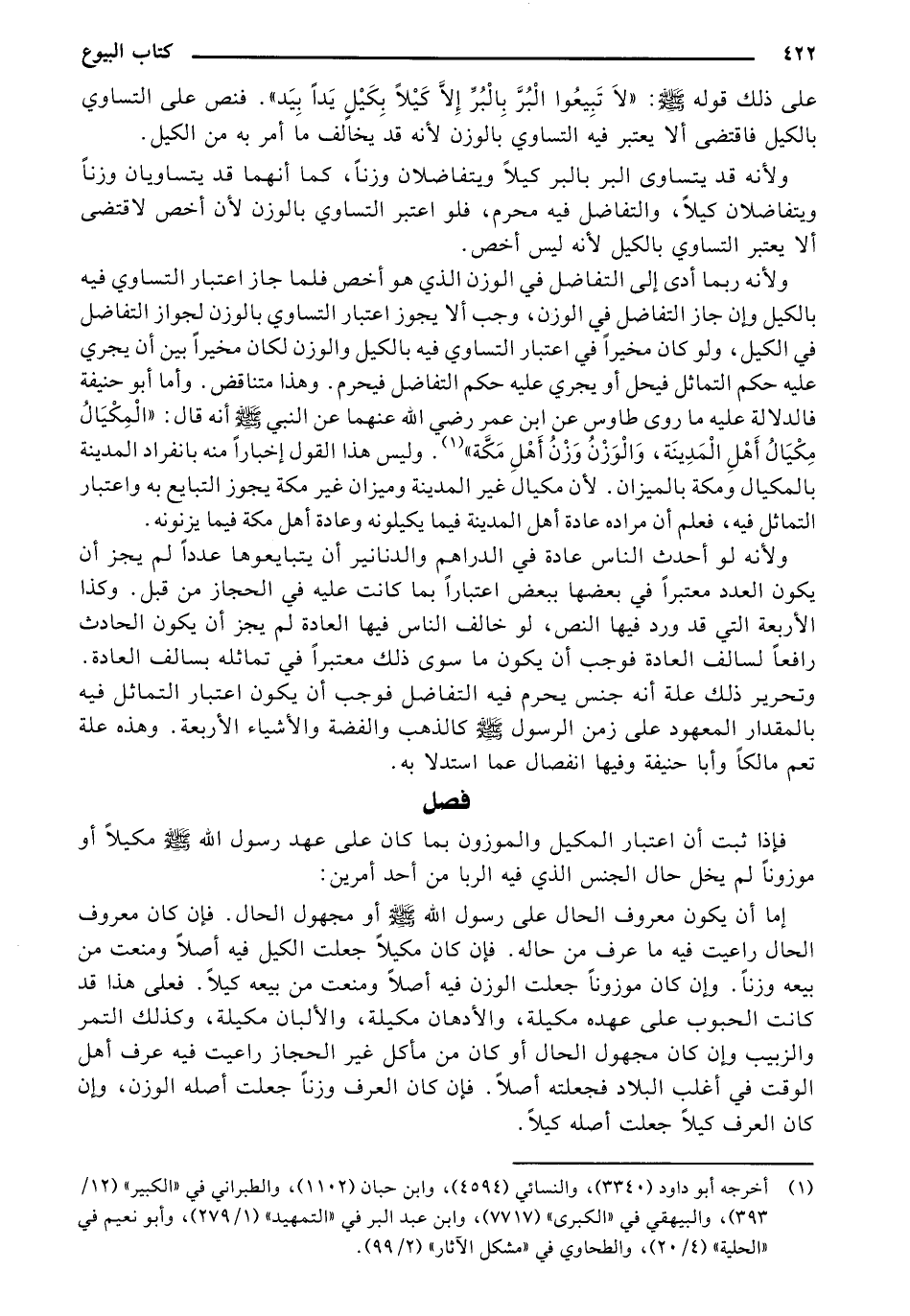 ولأنه ربما أدى إلى التفاضل في الوزن الذي هو أخص فلما جاز اعتبار التساوي فيه بالكيل وإن جاز التفاضل في الوزن، وجب ألا يجوز اعتبار التساوي بالوزن لجواز التفاضل في الكيل، ولو كان مخيراً في اعتبار التساوي فيه بالكيل والوزن لكان مخيراً بين أن يجري عليه حكم التماثل فيحل أو يجري عليه حكم التفاضل فيحرم. وهذا متناقض. وأما أبو حنيفة فالدلالة عليه ما روى طاوس عن ابن عمر رضي الله عنهما عن النبي - صلى الله عليه وسلم - أنه قال: "المكيال مكيال أهل المدينة، والوزن وزن أهل مكة" وليس هذا القول إخباراً منه بانفراد المدينة بالمكيال ومكة بالميزان. لأن مكيال غير المدينة وميزان غير مكة يجوز التبايع به واعتبار التماثل فيه، فعلم أن مراده عادة أهل المدينة فيما يكيلونه وعادة أهل مكة فيما يزنونه.
