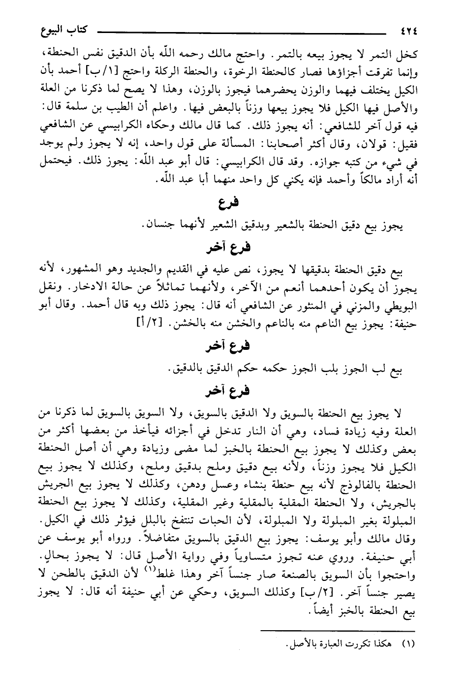 كخل التمر لا يجوز بيعه بالتمر. واحتج مالك رحمه الله بأن الدقيق نفس الحنطة، وإنما تفرقت أجزاؤها فصار كالحنطة الرخوة، والحنطة الركلة واحتج [1/ب] أحمد بأن الكيل يختلف فيهما والوزن يحضرهما فيجوز بالوزن، وهذا لا يصح لما ذكرنا من العلة والأصل فيها الكيل فلا يجوز بيعها وزناً بالبعض فيها. واعلم أن الطيب بن سلمة قال: فيه قول آخر للشافعي: أنه يجوز ذلك. كما قال مالك وحكاه الكرابيسي عن الشافعي فقيل: قولان، وقال أكثر أصحابنا: المسألة على قول واحد، إنه لا يجوز ولم يوجد في شيء من كتبه جوازه. وقد قال الكرابيسي: قال أبو عبد الله: يجوز ذلك. فيحتمل أنه أراد مالكاً وأحمد فإنه يكني كل واحد منهما أبا عبد الله.