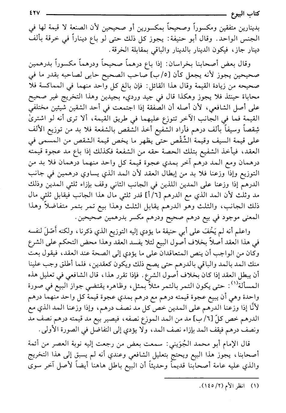 قال الإمام أبو محمد الجويني: سمعت بعض من رجعت إليه نوبة العصر من أئمة أصحابنا، يجوز هذا البيع ويحتج بتعليل الشافعي وعندي أنه لم يسبق إلى هذا التخريج والذي عليه عامة أصحابنا قديماً وحديثاً أن البيع باطل هاهنا أيضاً لأصل آخر سوى