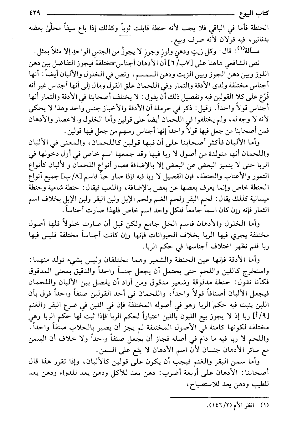 مسألة: قال: وكل زيت ودهن ولوز وجوز لا يجوز من الجنس الواحد إلا مثلاً بمثل. نص الشافعي هاهنا على [7 ب/6] أن الأدهان أجناس مختلفة فيجوز التفاضل بين دهن اللوز وبين دهن الجوز وبين الزيت ودهن السمسم، ونص في الخلول والألبان أيضاً: أنها أجناس مختلفة ولدى الأدقة والثمار وفي اللحمان علق القول ومال إلى أنها أجناس غير أنه فوع على كلا القولين فيه وتفصيل ذلك أن يقول: لا يختلف أصحابنا في الأدقة والثمار أنها أجناس قولاً واحداً. وقيل: ذكر في حرملة أن الأدقة والأخباز جنس واحد وهذا لا يحكى لأنه لا وجه له، ولم يختلفوا في اللحمان أيضاً على قولين وأما الخلول والأعصار والأدهان فمن أصحابنا من جعل فيها قولاً واحداً إنها أجناس ومنهم من جعل فيها قولين.