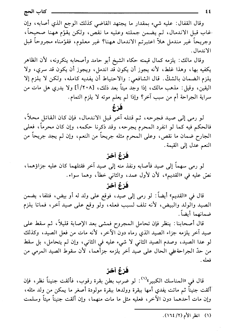 قال أصحابنا: ينظر فإن تحامل المجروح فمشى بعد الإصابة قليلاً، ثم سقط على صيد آخر يلزمه جزا، الصيد الذي رماه دون الآخر، لأنه مات من فعل الصيد، وكذلك لو عدا الصيد، وصدم الصيد الثاني لا شيء عليه في الثاني، وان لم يتحامل، بل سقط من حد الجراحة ففي الحال على صيد أخر يلزمه جزأهما، لأن سقوط الصيد المرمي من فعله.