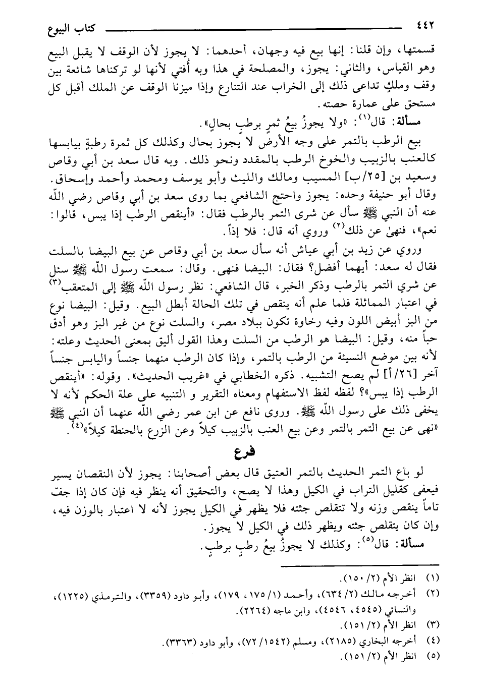 بيع الرطب بالتمر على وجه الأرض لا يجوز بحال وكذلك كل ثمرة رطبة بيابسها كالعنب بالزبيب والخوخ الرطب بالمقدد ونحو ذلك. وبه قال سعد بن أبي وقاص وسعيد بن [25/ب] المسيب ومالك والليث وأبو يوسف ومحمد وأحمد وإسحاق. وقال أبو حنيفة وحده: يجوز واحتج الشافعي بما روى سعد بن أبي وقاص رضي الله عنه أن النبي - صلى الله عليه وسلم - سأل عن شرى التمر بالرطب فقال: "أينقص الرطب إذا يبس، قالوا: نعم"، فنهى عن ذلك وروي أنه قال: فلا إذاً.
