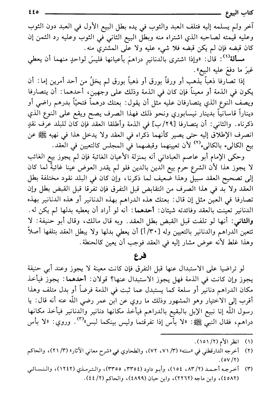 إذا تصارفا ذهباً بذهب أو ورقاً بورق أو ذهباً بورق لم يخل من أحد أمرين إما: أن يكون في الذمة أو معيناً فإن كان في الذمة وذلك على وجهين، أحدهما: أن يتصارفا ويصف النوع الذي يتصارفان عليه مثل أن يقول: بعتك درهماً فتحياً درهم راضي أو ديناراً قاسانياً بدينار نيسابوري ونحو ذلك فهذا الصرف يصح ويقع على النوع الذي ذكرناه. والثاني: أن يتصارفا [29/ب] في الذمة وأطلقا العقد فإن كان للبلد عرف نقد انصرف الإطلاق إليه حتى يصير كأنهما ذكراه في العقد ولا يدخل هذا في نهيه - صلى الله عليه وسلم - عن بيع الكالئ بالكالئ لأن تعيينهما وقبضهما في المجلس كالتعيين في العقد.