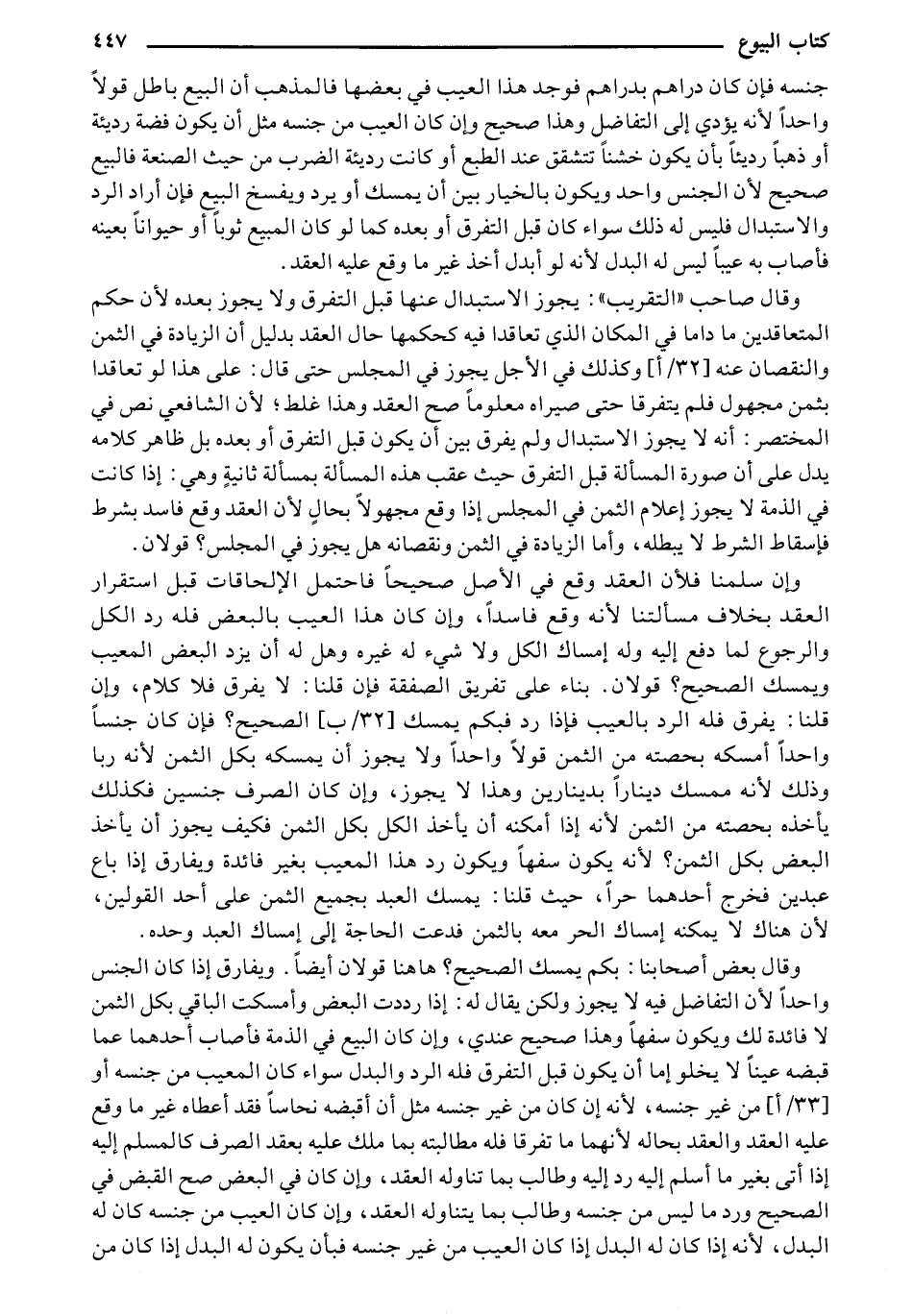 وقال بعض أصحابنا: بكم يمسك الصحيح؟ هاهنا قولان أيضاً. ويفارق إذا كان الجنس واحداً لأن التفاضل فيه لا يجوز ولكن يقال له: إذا رددت البعض وأمسكت الباقي بكل الثمن لا فائدة لك ويكون سفهاً وهذا صحيح عندي، وإن كان البيع في الذمة فأصاب أحدهما عما قبضه عيناً لا يخلو إما أن يكون قبل التفرق فله الرد والبدل سواء كان المعيب من جنسه أو [32:أ] من غير جنسه، لأنه إن كان من غير جنسه مثل أن أقبضه نحاساً فقد أعطاه غير ما وقع عليه العقد والعقد بحاله لأنهما ما تفرقا فله مطالبته بما ملك عليه بعقد الصرف كالمسلم إليه إذا أتى بغير ما أسلم إليه رد إليه وطالب بما تناوله العقد، وإن كان في البعض مع القبض في الصحيح ورد ما ليس من جنسه وطالب بما يتناوله العقد، وإن كان العيب من جنسه كان له البدل، لأنه إذا كان له البدل إذا كان العيب من غير جنسه فبأن يكون له البدل إذا كان من