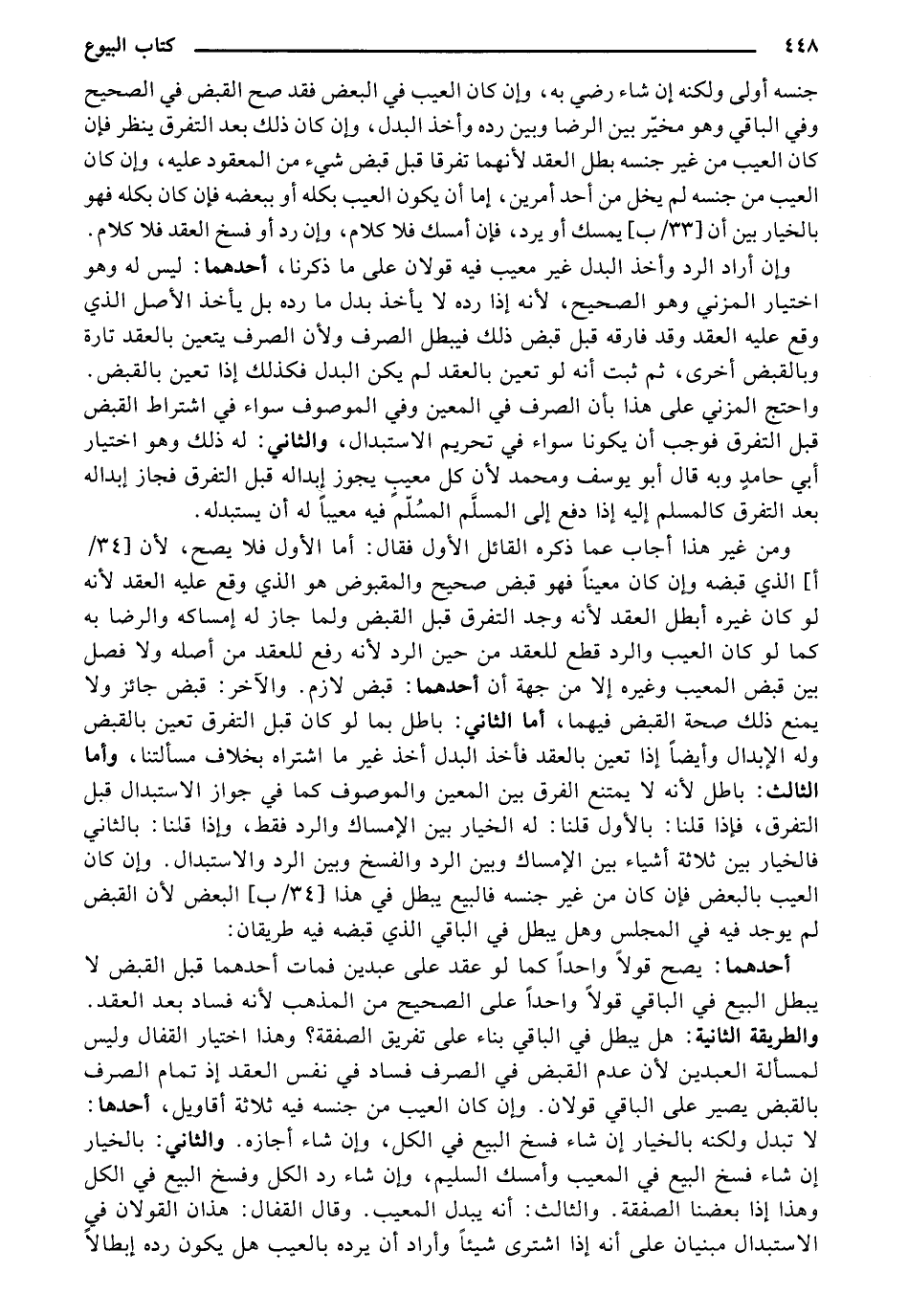 ومن غير هذا أجاب عما ذكره القائل الأول فقال: أما الأول فلا يصح، لأن [34/أ] الذي قبضه وإن كان معيناً فهو قبض صحيح والمقبوض هو الذي وقع عليه العقد لأنه لو كان غيره أبطل العقد لأنه وجد التفرق قبل القبض ولما جاز له إمساكه والرضا به كما لو كان العيب والرد قطع للعقد من حين الرد لأنه رفع للعقد من أصله ولا فصل بين قبض المعيب وغيره إلا من جهة أن أحدهما: قبض لازم. والآخر: قبض جائز ولا يمنع ذلك صحة القبض فيهما، أما الثاني: باطل بما لو كان قبل التفرق تعين بالقبض وله الإبدال وأيضاً إذا تعين بالعقد فأخذ البدل أخذ غير ما اشتراه بخلاف مسألتنا، وأما الثالث: باطل لأنه لا يمتنع الفرق بين المعين والموصوف كما في جواز الاستبدال قبل التفرق، فإذا قلنا: بالأول قلنا: له الخيار بين الإمساك والرد فقط، وإذا قلنا: بالثاني فالخيار بين ثلاثة أشياء بين الإمساك وبين الرد والفسخ وبين الرد والاستبدال. وإن كان العيب بالبعض فإن كان من غير جنسه فالبيع يبطل في هذا [34/ب] البعض لأن القبض لم يوجد فيه في المجلس وهل يبطل في الباقي الذي قبضه فيه طريقان: