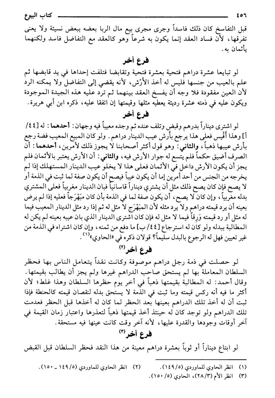 لو حصلت في ذمة رجل دراهم موصوفة وكانت نقدًا يتعامل الناس بها فحظر السلطان المعاملة بها لم يستحق صاحب الدراهم غيرها ولم يجز أن يطالب بقيمتها. وقال أحمد: له المطالبة بقيمتها ذهبًا في أخر يوم حظرها السلطان وهذا غلط؛ لأن أكثر ما فيه أنه ركس قيمته وما ثبت في الذمة لا يستحق بدله لنقصان قيمته كالحنطة فإذا ثبت أن له أخذ تلك الدراهم بعينها بعد الحظر لما كان له أخذها قبل الحظر فعدمت تلك الدراهم ولو توجد كان له حينئذ أخذ قيمتها ذهبًا لتعذرها واعتبار زمان القيمة في آخر أوقات وجودها والقدرة عليها، لأنه آخر وقت كانت عينها فيه مستحقة.