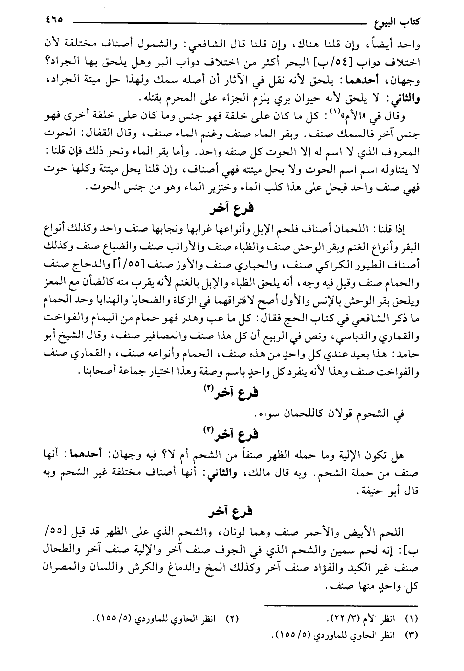 إذا قلنا: اللحمان أصناف فلحم الإبل وأنواعها غرابها ونجابها صنف واحد وكذلك أنواع البقر وأنواع الغنم وبقر الوحش صنف والظباء صنف والأرانب صنف والضباع صنف وكذلك أصناف الطيور الكراكي صنف، والحباري صنف والأوز صنف [55/أ] والدجاج صنف والحمام صنف وقيل فيه وجه، أنه يلحق الظباء والإبل بالغنم لأنه يقرب منه كالضأن مع المعز ويلحق بقر الوحش بالإنس والأول أصح لافتراقهما في الزكاة والضحايا والهدايا وحد الحمام ما ذكر الشافعي في كتاب الحج فقال: كل ما عب وهدر فهو حمام من اليمام والفواخت والقماري والدباسي، ونص في الربيع أن كل هذا صنف والعصافير صنف، وقال الشيخ أبو حامد: هذا بعيد عندي كل واحٍد من هذه صنف، الحمام وأنواعه صنف، والقماري صنف والفواخت صنف وهذا لأنه يتفرد كل واحٍد باسم وصفة وهذا اختيار جماعة أصحابنا.
