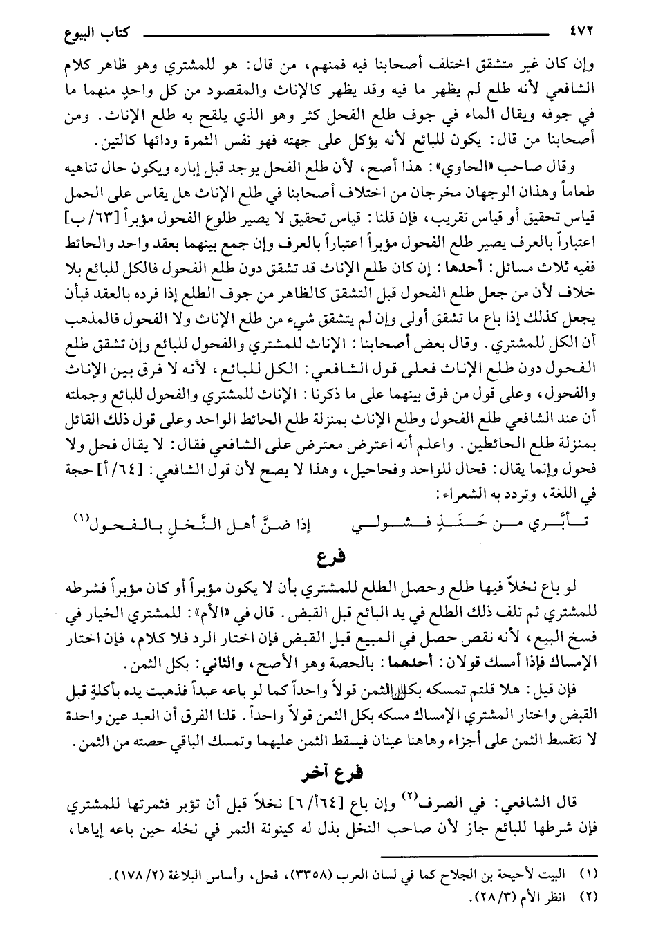وقال صاحب (الحاوي): هذا أصح، لأن طلع الفحل يوجد قبل إباره ويكون حال تناهيه طعامًا وهذان الوجهان مخرجان من اختلاف أصحابنا في طاع الإناث هل يقاس على الحمل قياس تحقيق أو قياس تقريب، فإن قلنا: قياس تحقيق لا يصير طلوع الفحول مؤبرًا [63/ ب] اعتبارًا بالعرف يصير طلع الفحول مؤبرًا اعتبارًا بالعرف وإن جمع بينهما بعقد واحد والحائط ففيه ثلاث مسائل: أحدها: إن كان طلع الإناث قد تشقق دون طلع الفحول فالكل للبائع بلا خلاف لأن من جعل طلع الفحول قبل التشقق كالظاهر من جوف الطلع إذا فرده بالعقد فبأن يجعل كذلك إذا باع ما تشقق أولى وإن لم يتشقق شيء من طلع الإناث ولا الفحول فالمذهب أن الكل للمشتري. وقال بعض أصحابنا: الإناث للمشتري والفحول للباع وإن تشقق طلع الفحول دون طلع الإناث فعلى قول الشافعي: الكل للبائع، لأنه لا فرق بين الإناث والفحول، وعلى قول من فرق بينهما على ما ذكرنا: الإناث للمشتري والفحول للبائع وجملته أن عند الشافعي طلع الفحول وطلع الإناث بمنزلة طلع الحائط الواحد وعلى قول ذلك القائل بمنزلة طلع الحائطين. واعلم أنه اعترض معترض على الشافعي فقال: لا يقال فحل ولا فحول وإنما يقال: فحال للواحد وفحاحيل, وهذا لا يهم لأن قول الشافعي: [64/ أ] حجة في اللغة، وتردد به الشعراء: