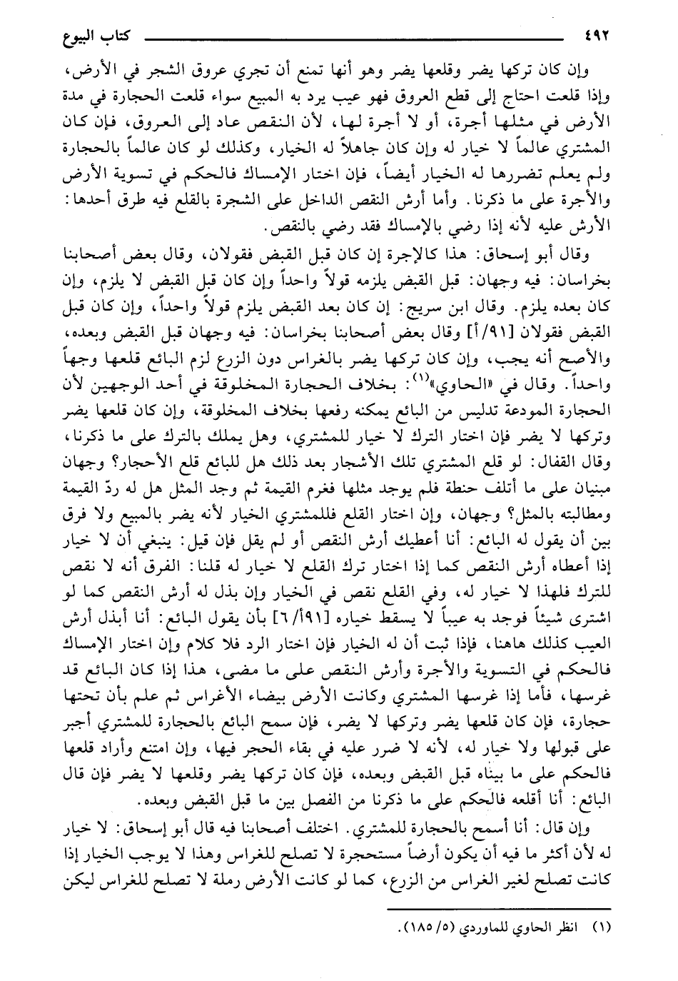 وقال أبو إسحاق: هذا كالأجرة إن كان قبل القبض فقولان، وقال بعض أصحابنا بخراسان: فيه وجهان: قبل القبض يلزمه قولًا واحدًا وإن كان قبل القبض لا يلزم، وإن كان بعده يلزم. وقال ابن سريج: إن كان بعد القبض يلزم قولًا واحدًا، وإن كان قبل القبض فقولان [91/ أ] وقال بعض أصحابنا بخراسان: فيه وجهان قبل القبض وبعده، والأصح أنه يجب، وإن كان تركها يضر بالغراس دون الزرع لزم البائع قلعها وجهًا واحدًا. وقال في (الحاوي): بخلاف الحجارة المخلوقة في أحد الوجهين لأن الحجارة المودعة تدليس من البائع يمكنه رفعها بخلاف المخلوقة، وإن كان قلعها يضر وتركها لا يضر فإن اختار الترك لا خيار للمشتري، وهل يملك بالترك على ما ذكرنا، وقال القفال: لو قلع المشتري تلك الأشجار بعد ذلك هل للبائع قلع الأحجار؟ وجهان مبنيان على ما أتلف حنطة فلم يوجد مثلها فغرم القيمة ثم وجد المثل هل له رّد القيمة ومطالبته بالمثل؟ وجهان، وإن اختار القلع فللمشتري الخيار لأنه يضر بالمبيع ولا فرق بين أن يقول له البائع: أنا أعطيك أرش النقص أو لم يقل فإن قيل: ينبغي أن لا خيار إذا أعطاه أرش النقص كما إذا اختار ترك القلع لا خيار له قلنا: الفرق أنه لا نقص للترك فلهذا لا خيار له، وفي القلع نقصى في الخيار وإن بذل له أرش النقص كما لو اشترى شيئًا فوجد به عيبًا لا يسقط خياره [91 أ/ 6] بأن يقول البائع: أنا أبذل أرش العيب كذلك هاهنا، فإذا ثبت أن له الخيار فإن اختار الرد فلا كلام وإن اختار الإمساك فالحكم في التسوية والأجرة وأرش النفس على ما مضى، هذا إذا كان البائع قد غرسها، فأما إذا غرسها المشتري وكانت الأرض بيضاء الأغراس ثم علم بأن تحتها حجارة، فإن كان قلعها يضر وتركها لا يضر، فإن سمح البائع بالحجارة للمشتري أجبر على قبولها ولا خيار له، لأنه لا ضرر عليه في بقاء الحجر فيها، وإن امتنع وأراد قلعها فالحكم على ما بيناه قبل القبض وبعده، فإن كان تركها يضر وقلعها لا يضر فإن قال البائع: أنا أقلعه فالحكم على ما ذكرنا من الفصل بين ما قبل القبض وبعده.