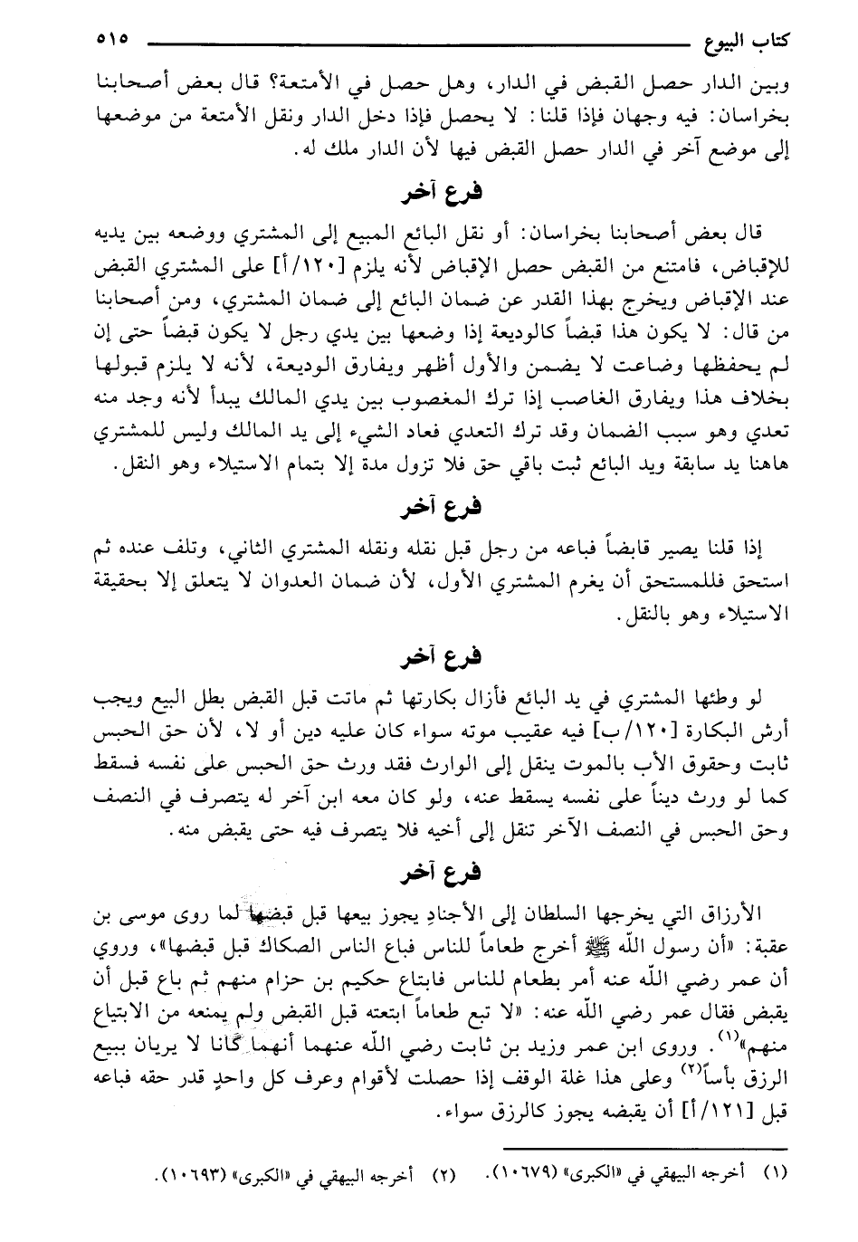 الأرزاق التي يخرجها السلطان إلى الأجناد يجوز بيعها قبل قبضها لما روى موسى بن عقبة: "أن رسول الله - صلى الله عليه وسلم - أخرج طعاماً للناس فباع الناس الصكاك قبل قبضها"، وروي أن عمر - رضي الله عنه - أمر بطعام للناس فابتاع حكيم بن حزام منهم ثم باع قبل أن يقبض فقال عمر - رضي الله عنه -: "لا تبع طعاماً ابتعته قبل القبض ولم يمنعه من الابتياع منهم". وروى ابن عمر وزيد بن ثابت رضي الله عنهما أنهما كانا لا يريان ببيع الرزق بأساً وعلى هذا غلة الوقوف إذا حصلت لأقوام وعرف كل واحد قدر حقه فباعه قبل [121/ أ] أن يقبضه يجوز كالرزق سواء.