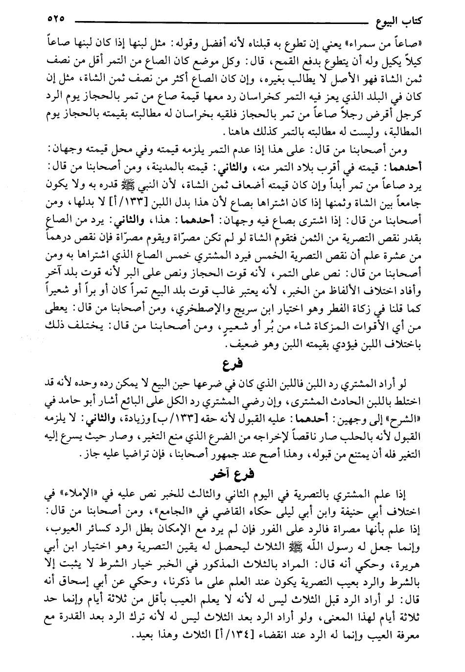 ومن أصحابنا من قال: على هذا إذا عدم التمر يلزمه قيمته وفي محل قيمته وجهان: أحدهما: قيمته في أقرب بلاد التمر منه، والثاني: قيمته بالمدينة، ومن أصحابنا من قال: يرد صاعاً من تمر أبداً وإن كان قيمته أضعاف ثمن الشاة، لأن النبي - صلى الله عليه وسلم - قدره به ولا يكون جامعاً بين الشاة وثمنها إذا كان اشتراها بصاع لأن هذا بدل اللبن [133/ أ] لا بدلها، ومن أصحابنا من قال: إذا اشترى بصاع فيه وجهان: أحدهما: هذا، والثاني: يرد من الصاع بقدر نقص التصرية من الثمن فتقوم الشاة لو لم تكن مصراة ويقوم مصراة فإن نقص درهماً من عشرة علم أن نقص التصرية الخمس فيرد المشتري خمس الصاع الذي اشتراها به ومن أصحابنا من قال: نص على التمر، لأنه قوت الحجاز ونص على البر لأنه قوت بلد آخر وأفاد اختلاف الألفاظ من الخبر، لأنه يعتبر غالب قوت بلد البيع تمراً كان أو براً أو شعيراً كما قولنا في زكاة الفطر وهو اختيار ابن سريج والإصطرخي، ومن أصحابنا من قال: يعطي من أي الأقوات المزكاة شاء من بر أو شعير، ومن أصحابنا من قال: يختلف ذلك باختلاف اللبن فيؤدي بقيمته اللبن وهو ضعيف.