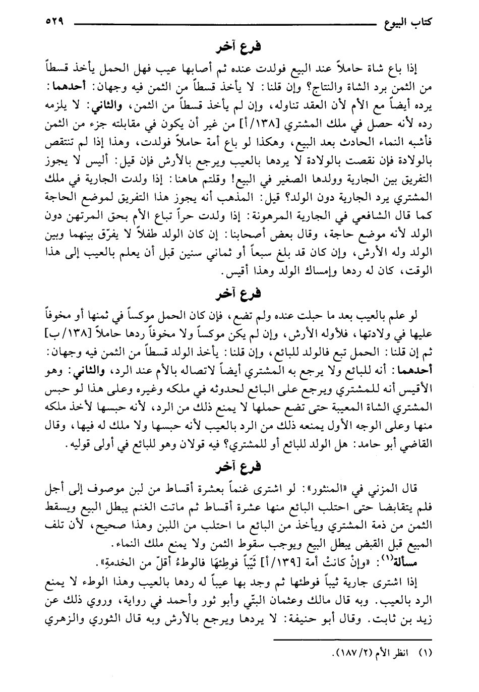 إذا باع شاة حاملاً عند البيع فولدت عنده ثم أصابها عيب فهل الحمل يأخذ قسطاً من الثمن برد الشاة والنتائج؟ وإن قلنا: لا يأخذ قسطاً من الثمن فيه وجهان: أحدهما: يرده أيضاً مع الأم لأن العقد تناوله، وإن لم يأخذ قسطاً من الثمن، والثاني: لا يلزمه رده لأنه حصل في ملك المشتري [138/ أ] من غير أن يكون في مقابلته جزء من الثمن فأشبه النماء الحادث بعد البيع، وهكذا لو باع أمة حاملاً فولدت، وهذا إذا لم تنتقص بالولادة فإن نقصت بالولادة لا يردها بالعيب ويرجع بالأرش فإن قيل: أيس لا يجوز التفريق بين الجارية وولدها الصغير في البيع! وقلتم ها هنا: إذا ولدت الجارية في ملك المشتري يرد الجارية دون الولد؟ قيل: المذهب أنه يجوز هذا التفريق لموضع الحاجة كما قال الشافعي في الجارية المرهونة: إذا ولدت حراً تباع الأم بحق المرتهن دون الولد لأنه موضع حاجة، وقال بعض أصحابنا: إن كان الولد طفلاً لا يفرق بينهما وبين الولد وله الأرش، وإن كان قد بلغ سبعاً أو ثماني سنين قبل أن يعلم بالعيب إلى هذا الوقت، كان له ردها وإمساك وهذا أقيس.