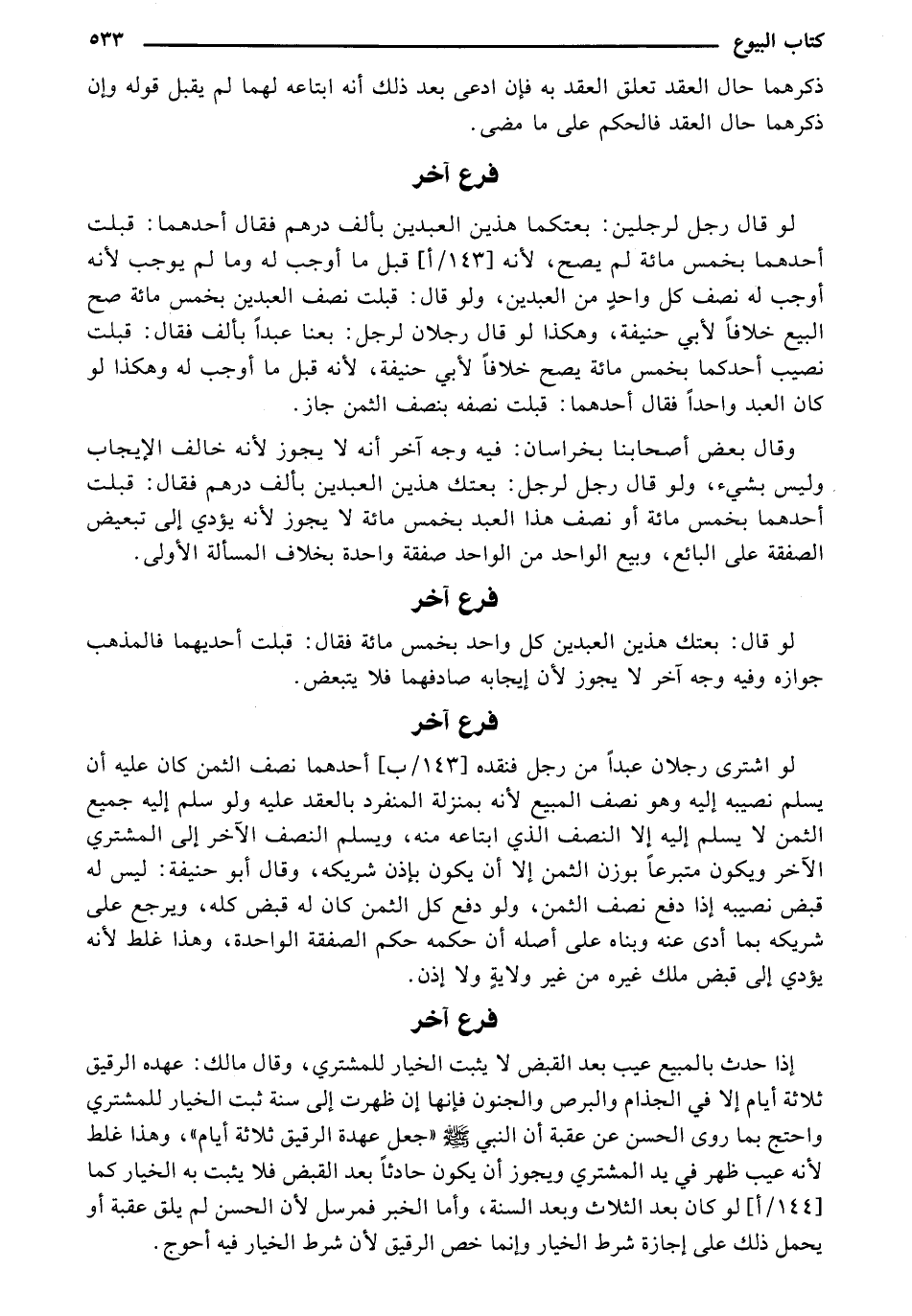 لو قال رجل لرجلين: بعتكما هذين العبدين بألف درهم فقال أحدهما: قبلت أحدهما بخمس مائة لم يصح، لأنه [143/ أ] قبل ما أوجب له وما لم يوجب لأنه أوجب له نصف كل واحد من العبدين، ولو قال: قبلت نصف العبدين بخمس مائة صح البيع خلافاً لأبي حنيفة، وهكذا لو قال رجلان لرجل: بعنا عبداً بألف فقال: قبلت نصيب أحدكما بخمس مائة يصح خلافاً لأبي حنيفة، لأنه قبل ما أوجب له وهكذا لو كان العبد واحداً فقال أحدهما: قبلت نصفه بنصف الثمن جاز.