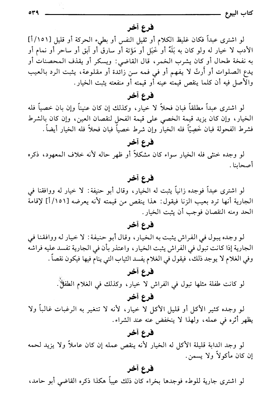 لو اشترى عبداً فكان غليظ الكلام أو ثقيل النفس أو بطيء الحركة أو قليل [151/ أ] الأدب لا خيار له ولو كان به بله أو خبل أو مؤتة أو سارق أو آبق أو ساحر أو نمام أو به نفخة طحال أو كان يشرب الخمر، قال القاضي: ويسكر أو يقذف المحصنات أو يدع الصلوات أو أرت لا يفهم أو في فمه سن زائدة أو مقلوعة، يثبت الرد بالعيب والأصل فيه أن كلما ينقص قيمته عينه أو قيمته أو منفعته يثبت الخيار.