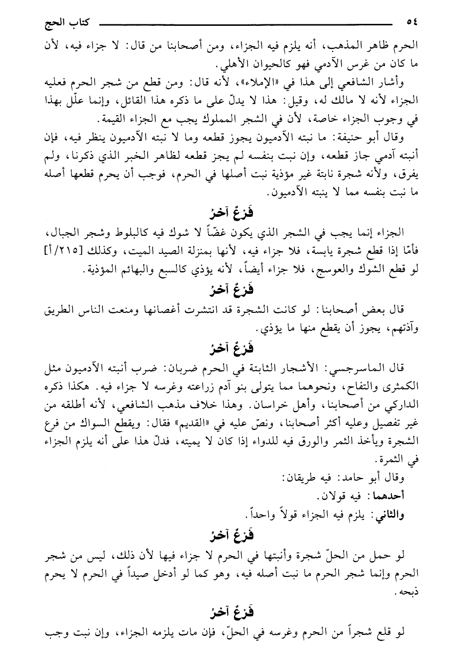 الجزاء إنما يجب في الشجر الذي يكون غضًا لا شوك فيه كالبلوط وشجر الجبال، فأما إذا قطع شجرة يابسة، فلا جزاء فيه، لأنها بمنزلة الصيد الميت، وكذلك [215/ أ] لو قطع الشوك والعوسج، فلا جزاء أيضًا، لأنه يؤذي كالسبع والبهائم المؤذية.