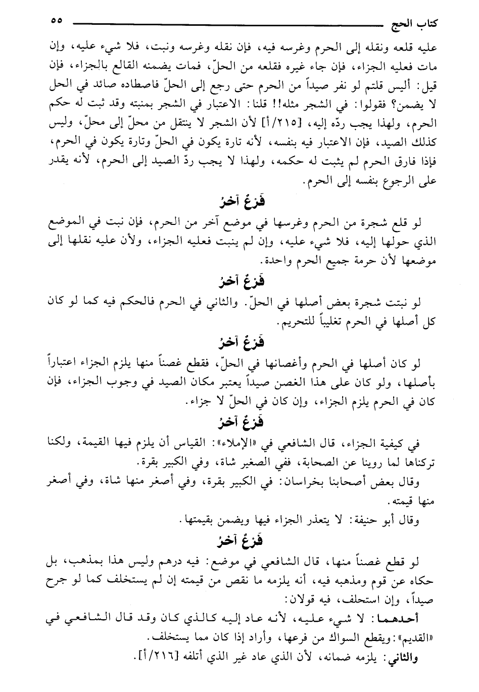 لو كان أصلها في الحرم وأغصانها في الحلّ فقطع غصنًا منها يلزم الجزاء اعتبارًا بأصلها، ولو كان على هذا الغصن صيدًا يعتبر مكان الصيد في وجوب الجزاء، فإن كان في الحرم يلزم الجزاء، وإن كان في الحل لا جزاء.