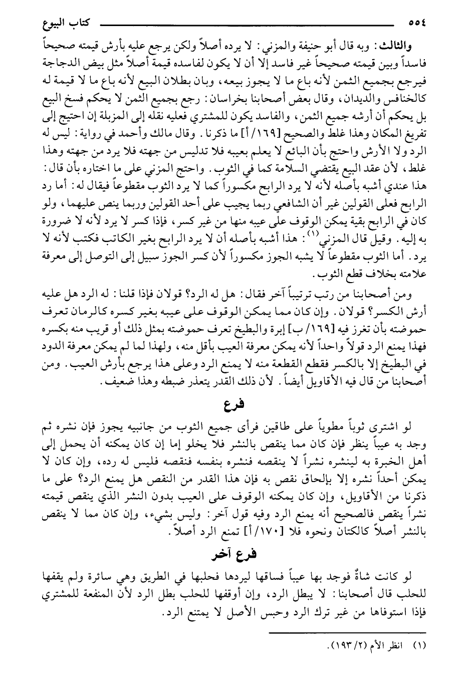 لو اشترى ثوباً مطوياً على طاقين فرأى جميع الثوب من جانبيه يجوز فإن نشره ثم وجد به عيباً ينظر فإن كان مما ينقص بالنشر فلا يخلو إما إن كان يمكنه أن يحمل إلى أهل الخبرة به لينشره نشراً لا ينقصه فنشره بنفسه فنقصه فليس له رده، وإن كان لا يمكن أحداً نشره إلا بإلحاق نقص هـ فإن هذا القدر من النقص هل يمنع الرد؟ على ما ذكرنا من الأقاويل، وإن كان يمكنه الوقوف على العيب بدون النشر الذي ينقص قيمته نشراً ينقص فالصحيح أنه يمنع الرد وفيه قول آخر: وليس بشيء، وإن كان مما لا ينقص بالنشر أصلاً كالكتان ونحوه فلا [170/ أ] تمنع الرد أصلاً.