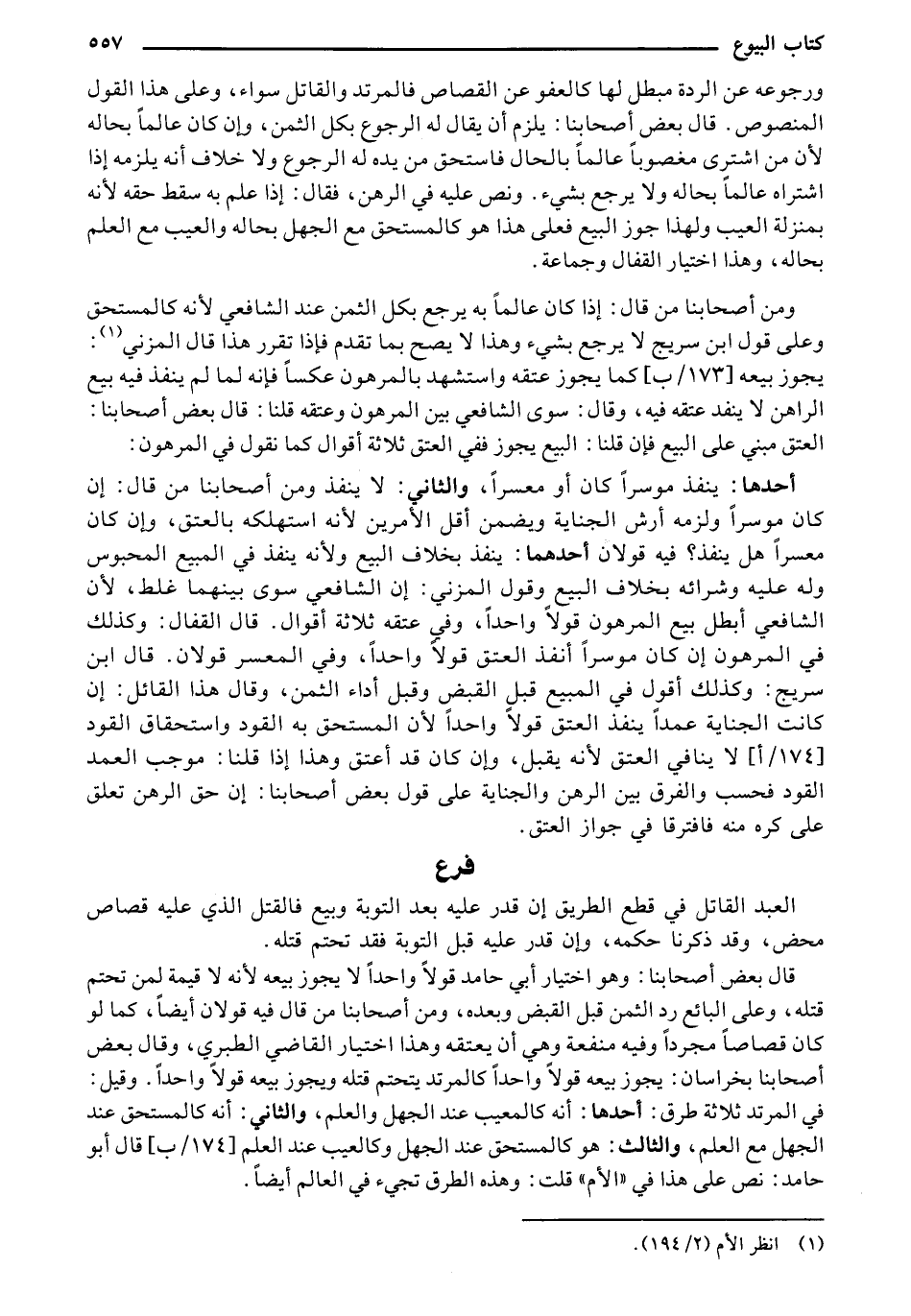 قال بعض أصحابنا: وهو اختيار أبي حامد قولًا واحدًا لا يجوز بيعه لأنه لا قيمة لمن تحتم قتله، وعلى البائع رد الثمن قبل القبض وبعده، ومن أصحابنا من قال فيه قولان أيضًا، كما لو كان قصاصًا مجردًا وفيه منفعة وهي أن يعتقه وهذا اختيار القاضي الطبري، وقال بعض أصحابنا بخراسان: يجوز بيعه قولًا واحدًا كالمرتد يتحتم قتله ويجوز بيعه قولًا واحدًا. وقيل في المرتد ثلاثة طرق: أحدها: أنه كالمعيب عند الجهل والعلم، والثاني: أنه كالمستحق عند الجهل مع العلم، والثالث: هو كالمستحق عند الجهل وكالعيب عند العلم [174/ ب] قال أبو حامد: نص على هذا في "الأم" قلت: وهذه الطرق تجيء في العالم أيضًا.