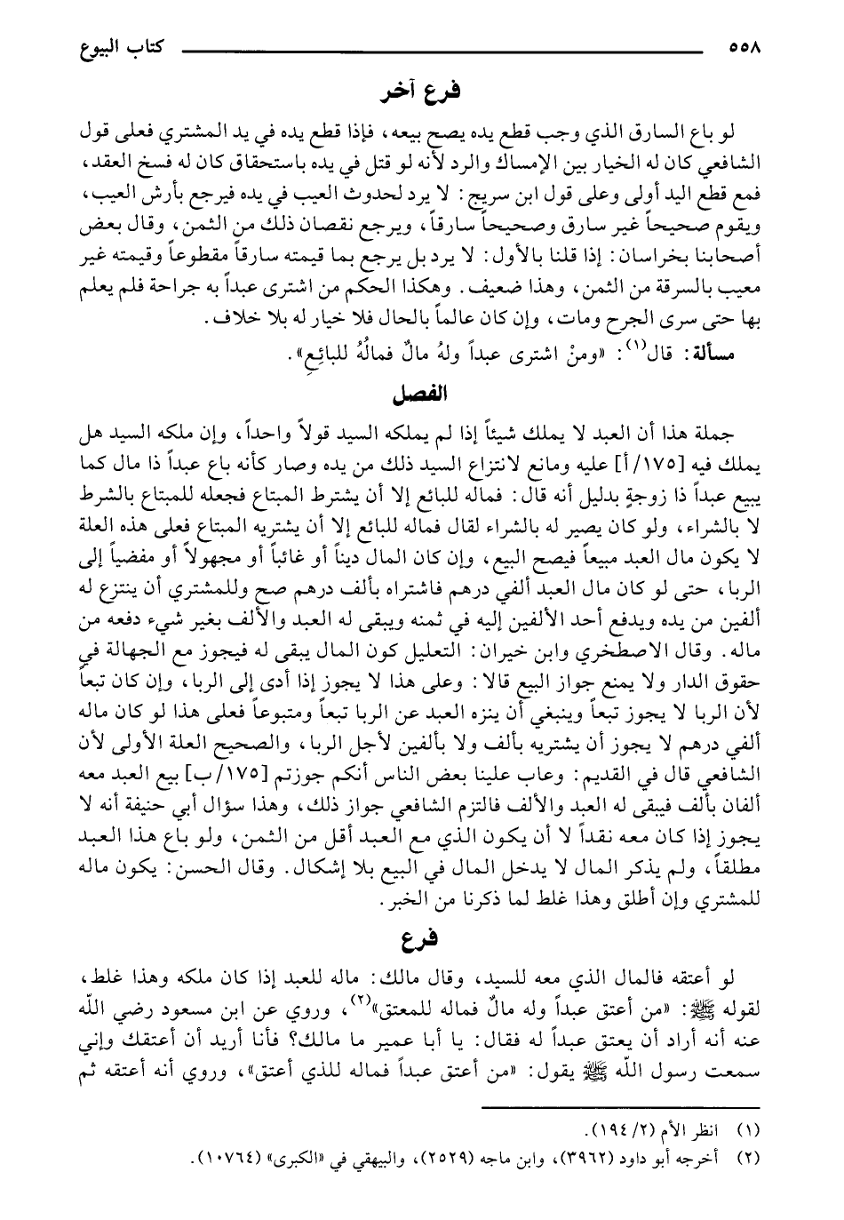 جملة هذا أن العبد لا يملك شيئًا إذا لم يملكه السيد قولًا واحدًا، وإن ملكه السيد هل يملك فيه [175/ أ] عليه ومانع لانتزاع السيد ذلك من يده وصار كأنه باع عبدًا ذا مال كما يبيع عبدًا ذا زوجٍة بدليل أنه قال: فماله للبائع إلا أن يشترط المبتاع فجعله للمبتاع بالشرط لا بالشراء، ولو كان يصير له بالشراء لقال فماله للبائع إلا أن يشتريه المبتاع فعلى هذه العلة لا يكون مال العبد مبيعًا فيصح البيع، وإن كان المال دينًا أو غائبًا أو مجهولًا أو مفضيًا إلى الربا، حتى لو كان مال العبد ألفي درهم فاشتراه بألف درهم صح وللمشتري أن ينتزع له ألفين من يده ويدفع أحد الألفين إليه في ثمنه ويبقى له العبد والألف بغير شيء دفعه من ماله. وقال الاصطخري وابن خيران: التعليل كون المال يبقى له فيجوز مع الجهالة في حقوق الدار ولا يمنع جواز البيع قالا: وعلى هذا لا يجوز إذا أدى إلى الربا، وإن كان تبعًا لأن الربا لا يجوز تبعًا وينبغي أن ينزه العبد عن الربا تبعًا ومتبوعًا فعلى هذا لو كان ماله ألفي درهم لا يجوز أن يشتريه بألف ولا بألفين لأجل الربا، والصحيح العلة الأولى لأن الشافعي قال في القديم: وعاب علينا بعض الناس أنكم جوزتم [175/ ب] بيع العبد معه ألفان بألف فيبقى له العبد والألف فالتزم الشافعي جواز ذلك، وهذا سؤال أبي حنيفة أنه لا يجوز إذا كان معه نقدًا لا أن يكون الذي مع العبد أقل من الثمن، ولو باع هذا العبد مطلقًا، ولم يذكر المال لا يدخل المال في البيع بلا إشكال. وقال الحسن: يكون ماله للمشتري وإن أطلق وهذا غلط لما ذكرنا من الخبر.