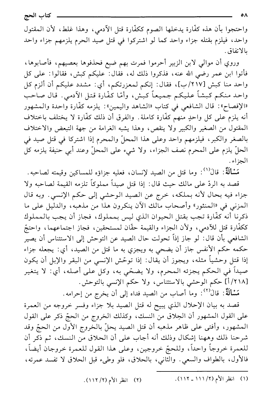 قصد به بيان الإحلال الذي يبيح له قتل الصيد بلا جزاء وفسر خروجه من العمرة على القول المشهور أن الحِلاق من النسك، وكذلك الخروج من الحج ذكر على القول المشهور، وأفتى على ظاهر مذهبه أن قتل الصيد يحل بالخروج الأول من الحج وقد شرحنا ذلك وههنا إشكال وذلك أنه أجاب على أن الحلاق من النسك، ثم ذكر أن للعمرة خروجًا واحدًا، وللحج خروجين، وعلى هذا القول للعمرة خروجان أيضًا، فالأول، بالطواف والسعي. والثاني، بالحلاق، فلو وطئ قبل الحلاق لا تفسد عمرته،