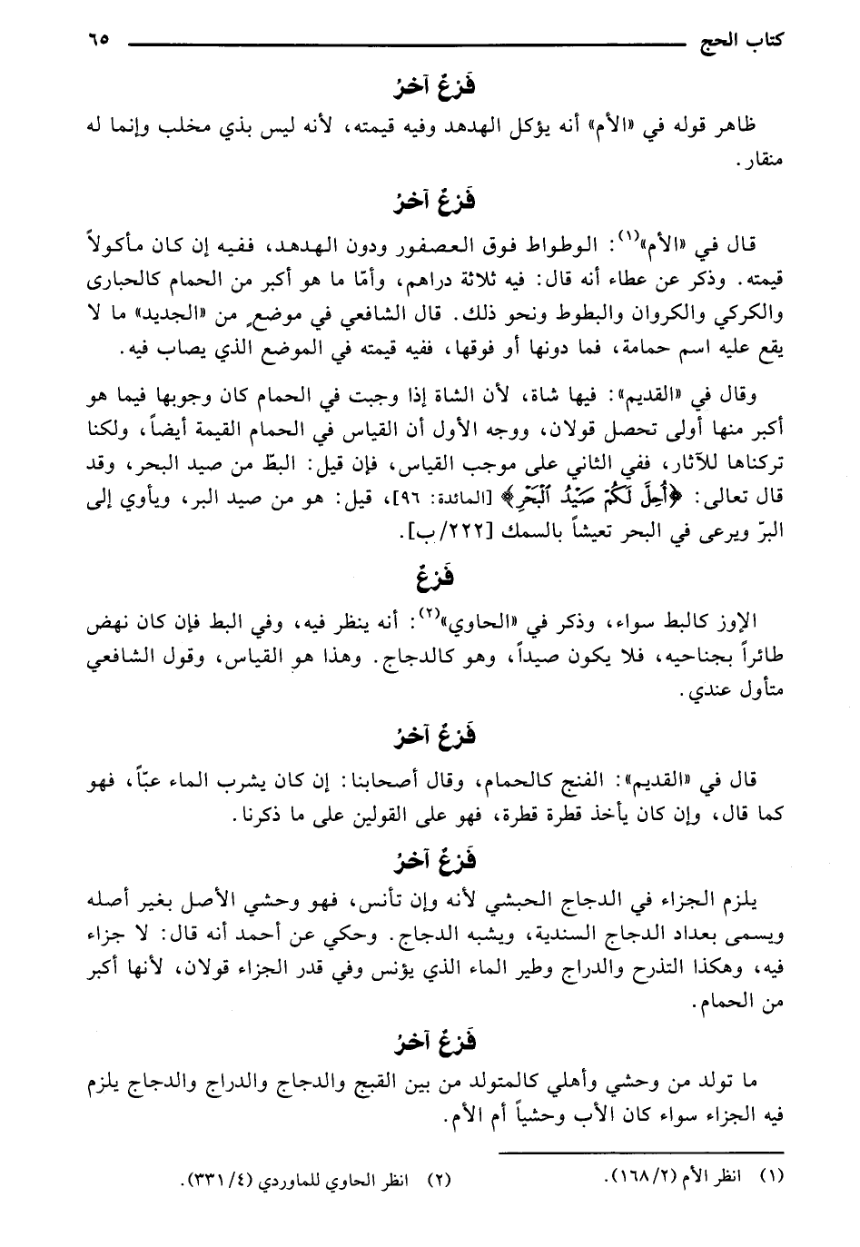 قال في "الأم": الوطواط فوق العصفور ودون الهدهد، ففيه أن كان مأكولًا قيمته. وذكر عن عطاء أنه قال: فيه ثلاثة دراهم، وأمّا ما هو أكبر من الحمام كالحبارى والكركي والكروان والبطوط ونحو ذلك. قال الشافعي في موضع من "الجديد" ما لا يقع عليه اسم حمامة، فما دونها أو فوقها، ففيه قيمته في الموضع الذي يصاب فيه.