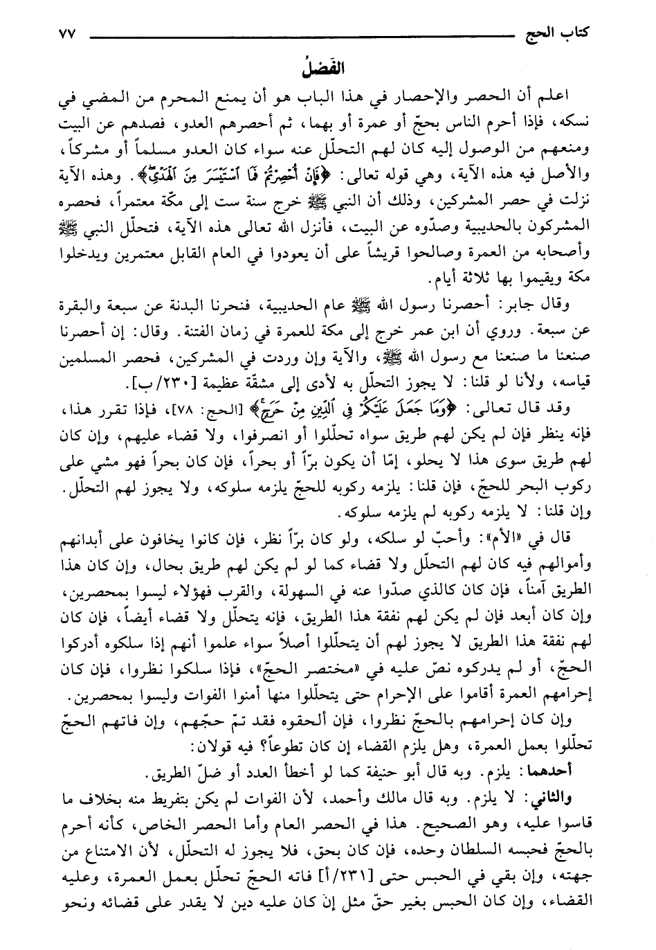 اعلم أن الحصر والإحصار في هذا الباب هو أن يمنع المحرم من المضي في نسكه، فإذا أحرم الناس بحج أو عمرة أو بهما، ثم أحصرهم العدو، فصدهم عن البيت ومنعهم من الوصول إليه كان لهم التحلل عنه سوا، كان العدو مسلمًا آو مشتركًا، والأصل فيه هذه الآية، وهي قوله تعالى: {فَإِنْ أُحْصِرْتُمْ فَمَا اسْتَيْسَرَ مِنْ الْهَدْيِ}. وهذه الآية نزلت في حصر المشركين، وذلك أن النبي - صلى الله عليه وسلم - خرج سنة ست إلى مكة معتمرًا، فحصره المشركون بالحديبية وصدّوه عن البيت، فأنزل الله تعالى هذه الآية، فتحلل النبي - صلى الله عليه وسلم - وأصحابه من العمرة وصالحوا قريشًا على أن يعودوا في العام القابل معتمرين ويدخلوا مكة ويقيموا بها ثلاثة أيام.