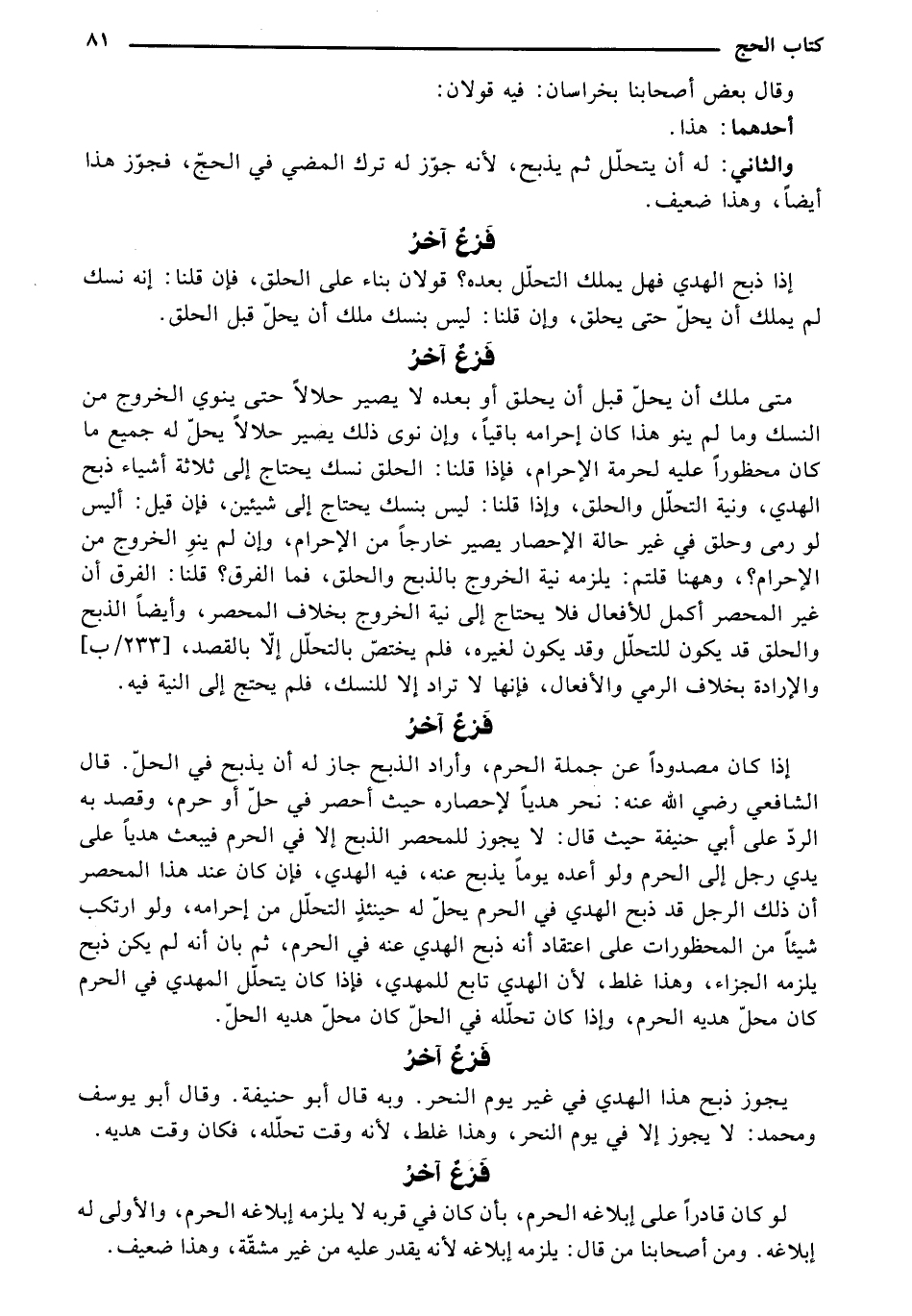 متى ملك أن يحلّ قبل أن يحلّق أو بعده لا يصير حلالاً حتى ينوي الخروج من النسك وما لم ينو هذا كان إحرامه باقياً، وإن نوى ذلك يصير حلالاً يحلّ له جميع ما كان محظوراً عليه لحرمة الإحرام، فإذا قلنا: الحلق نسك يحتاج إلى ثلاثة أشياء ذبح الهدي، ونية التحلّل والحلق، وإذا قلنا: ليس بنسك يحتاج إلى شيئين، فإن قيل: أليس لو رمى وحلق في غير حالة الإحصار يصير خارجاً من الإحرام، وإن لم ينو الخروج من الإحرام؟، وههنا قلتم: يلزمه نية الخروج بالذبح والحلق، فما الفرق؟ قلنا: الفرق أن غير المحصر أكمل للأفعال فلا يحتاج إلى نية الخروج بخلاف المحصر، وأيضًا الذبح والحلق قد يكون للتحلل وقد يكون لغيره، فلم يختص بالتحلّل إلا بالقصد، [233/ب] والإرادة بخلاف الرمي والأفعال، فإنها لا تراد إلا للنسك، فلم يحتج إلى النية فيه.