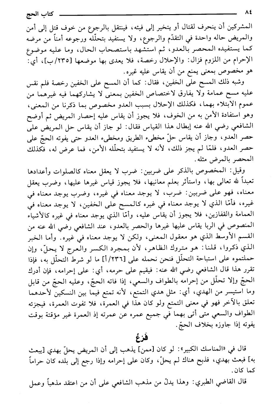 المشركين أن ينحرف لقتال أو يتخير إلى فيئه، فينتقل بالرجوع من خوف قتل إلى أمن والمريض حاله واحدة في التقدّم والرجوع، ولا يستفيد بتحلّله ورجوعه أمناً من مرضه كما يستفيده المحصر بالعدو، ثم استشهد باستصحاب الحال، وما عليه موضوع الإحرام من اللزوم فزال: والإحلال رخصة، فلا يعدى بها موضعها [235/ب]، أي: هو مخصوص بمعنى يمنع من أن يقاس علينه عيره.