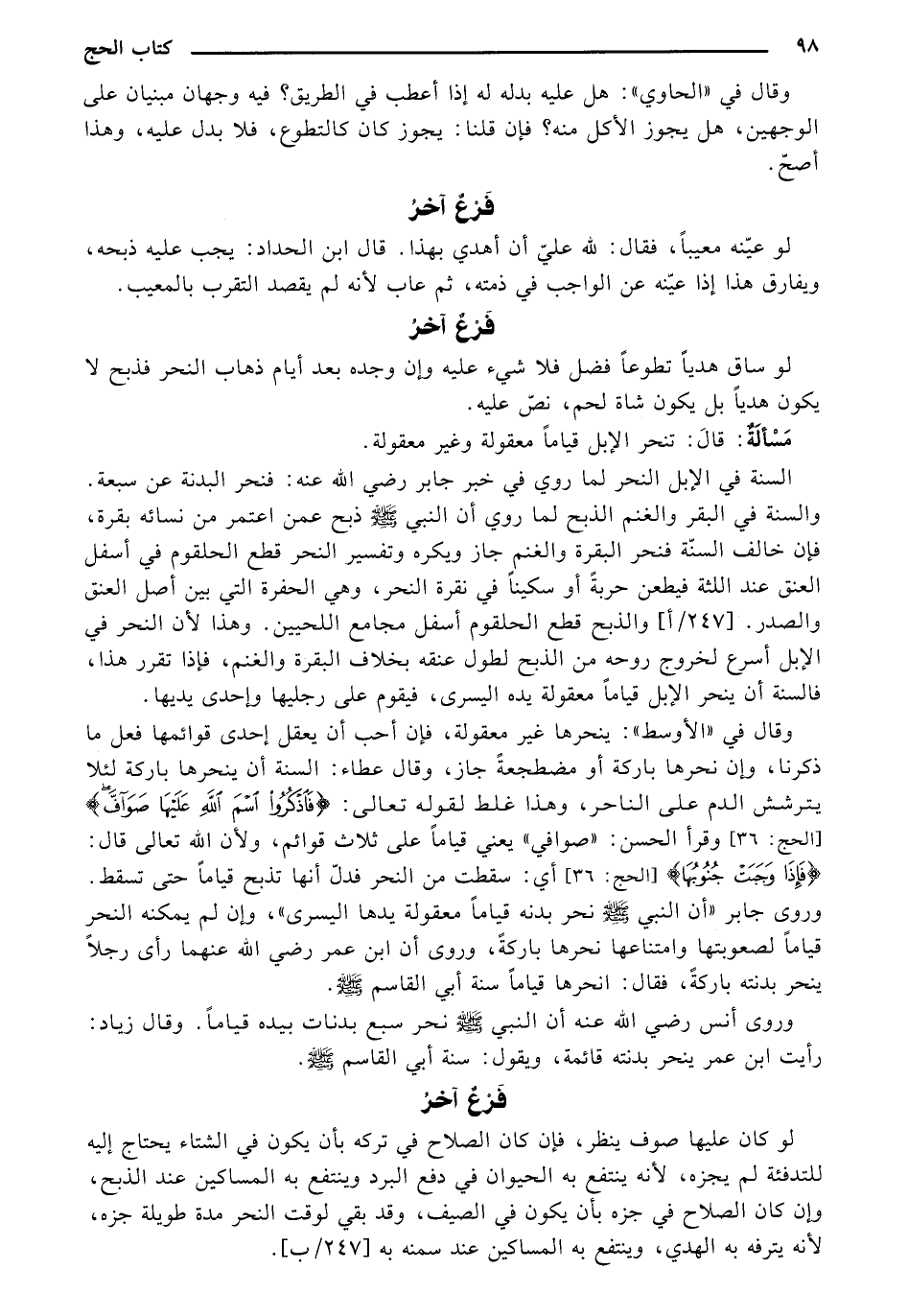 السنة في الإبل النحر لما روي في خبر جابر - رضي الله عنه -: فنحر البدنة عن سبعة. والسنة في البقر والغنم الذبح لما روي أن النبي - صلى الله عليه وسلم - ذبح عمن اعتمر من نسائه بقوة، فإذ خالف السنة فنحر البقرة والغنم جاز ويكره وتفسير النحر قطع الحلقوم في أسفل العنق عند اللثة فيطعن حربة أو سكيناً في نقرة الحر، وهي الحفرة التي بين أمل العنق والصدر. [247/أ] والذبح قطع الحلقوم أسفل مجامع اللحيين. وهذا لأن النحر في الإبل أسرع لخروج روحه من الذبح لطول عنقه بخلاف البقرة والغنم، فإذا تقرر هذا، فالسنة أن ينحر الإبل قياماً معقولة يده اليسرى، فيقوم على رجليها وإحدى يديها.