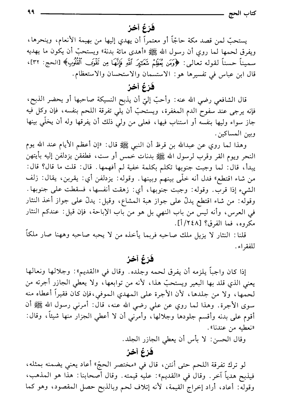إذا كان واجباً يلزمه أن يفرق لحمه وجلده. وقال في "القديم": وجلالها ونعالها يعني الذي قلد بها البعير ويستحب هذا، لأنه من توابعها، ولا يعطي الجازر أجرته من لحمها، ولا من جلدها، لأن الأجرة على المهدي الموفي، فإن كان فقيراً أعطاه منه سوى الأجرة. وهذا لما روي عن علي - رضي الله عنه -، قال: أمرني رسول الله - صلى الله عليه وسلم - أن أقوم على بدنه وأقسم جلودها وجلالها، وأمرني أن لا أعطي الجزار منها شيئاً، وقال: "نعطيه من عندنا".