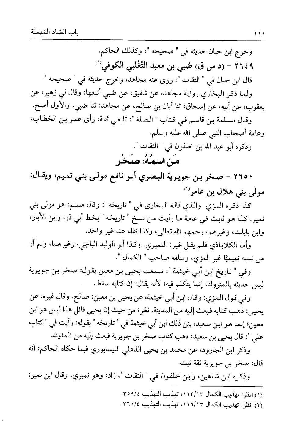 وفي قول المزي: وقال ابن أبي خيثمة، عن يحيى بن معين: صالح. وقال غيره، عن يحيى: ذهب كتابه فبعث إليه من المدينة. نظر؛ من حيث إن يحيى قائل هذا ليس هو ابن معين؛ إنما هو ابن سعيد، بيّن ذلك ابن أبي خيثمة في "تاريخه" بقوله: رأيت في "كتاب علي": قال يحيى بن سعيد: ذهب كتاب صخر بن جويرية فبعث إليه من المدينة.