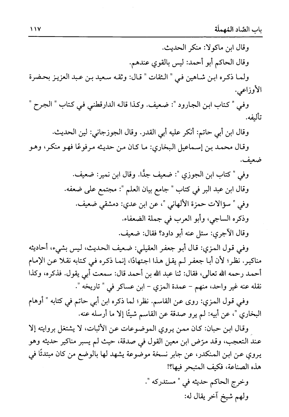 وفي قول المزي: قال أبو جعفر العقيلي: ضعيف الحديث، ليس بشيء، أحاديثه مناكير. نظر؛ لأن أبا جعفر لم يقل هذا اجتهادًا، إنما ذكره في كتابه نقلا عن الإمام أحمد رحمه اللَّه تعالى، فقال: ثنا عبد اللَّه بن أحمد قال: سمعت أبي يقول. فذكره، وكذا نقله عنه غير واحد، منهم -عمدة المزي- ابن عساكر في "تاريخه".