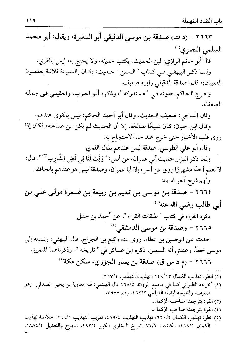 ٢٦٦٤ - صدقة بن موسى بن تميم بن ربيعة بن ضمرة مولى علي بن أبي طالب رضي اللَّه عنه (¬٣)