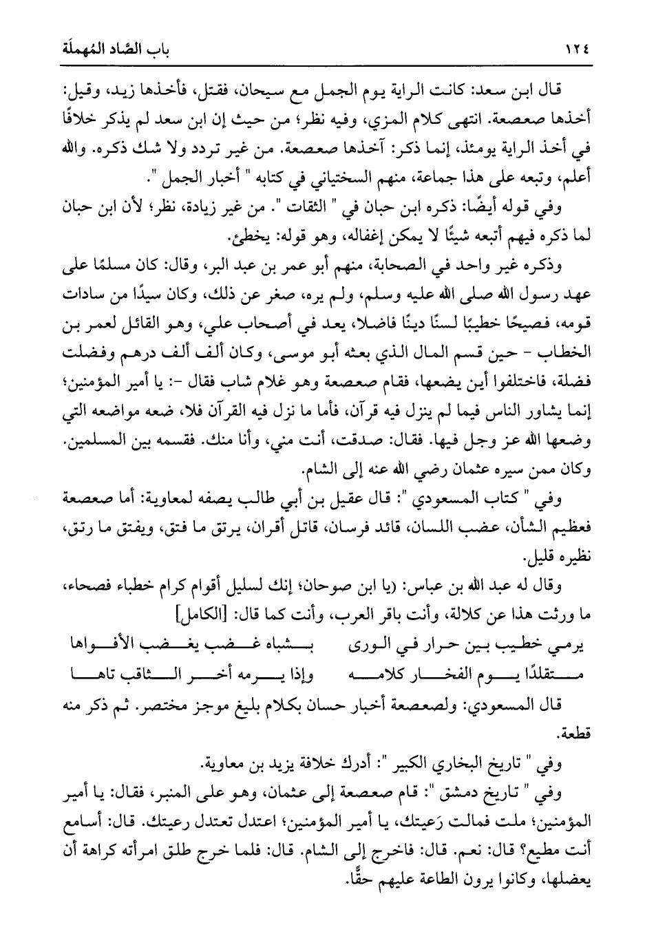 وفي "تاريخ دمشق": قام صعصعة إلى عثمان، وهو على المنبر، فقال: يا أمير المؤمنين؛ ملت فمالت رَعيتك، يا أمير المؤمنين؛ اعتدل تعتدل رعيتك. قال: أسامع أنت مطيع؟ قال: نعم. قال: فاخرج إلى الشام. قال: فلما خرج طلق امرأته كراهة أن يعضلها، وكانوا يرون الطاعة عليهم حقًّا.