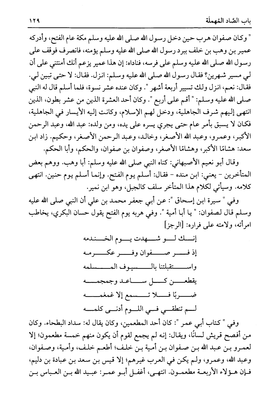 وفي "سيرة ابن إسحاق": عن أبي جعفر محمد بن علي أن النبي صلى اللَّه عليه وسلم قال لصفوان: "يا أبا أمية". وفي هربه يوم الفتح يقول حسان البكري، يخاطب امرأته، ولامته على فراره: [الرجز]