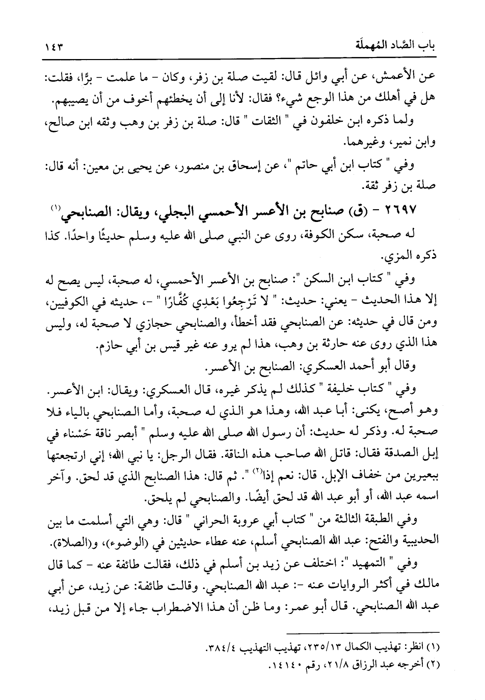 وفي "كتاب ابن السكن": صنابح بن الأعسر الأحمسي، له صحبة، ليس يصح له إلا هذا الحديث -يعني: حديث: "لا تَرْجِعُوا بَعْدِي كُفَّارًا"-، حديثه في الكوفيين، ومن قال في حديثه: عن الصنابحي فقد أخطأ، والصنابحي حجازي لا صحبة له، وليس هذا الذي روى عنه حارثة بن وهب، هذا لم يرو عنه غير قيس بن أبي حازم.