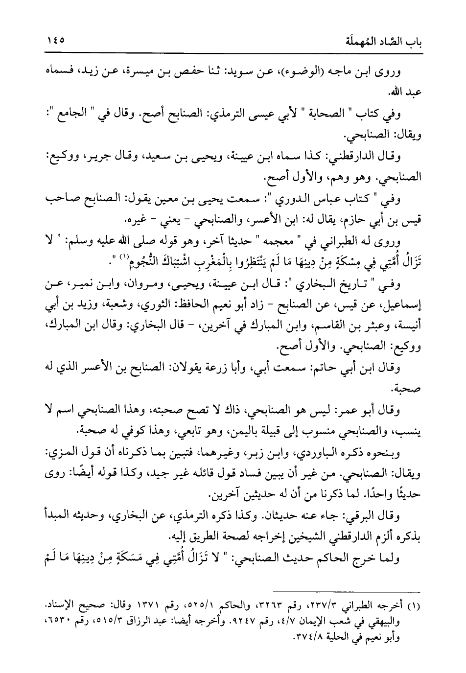 وبنحوه ذكره الباوردي، وابن زبر، وغيرهما، فتبين بما ذكرناه أن قول المزي: ويقال: الصنابحي. من غير أن يبين فساد قول قائله غير جيد، وكذا قوله أيضًا: روى حديثًا واحدًا. لما ذكرنا من أن له حديثين آخرين.
