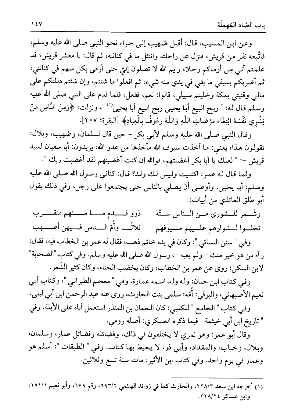 وعن ابن المسيب، قال: أقبل صُهيب إلى حراء نحو النبي صلى اللَّه عليه وسلم، فاتَّبعه نفر من قريش، فنزل عن راحلته وانتثل ما في كنانته، ثم قال: يا معشر قريش؛ قد علمتم أني مِن أرماكم رجلا، وايم اللَّه لا تصلون إليَّ حتى أرمي بكل سهم في كنانتي، ثم أضربكم بسيفي ما بقي في يدي منه شيء، ثم افعلوا ما شئتم، وإن شئتم دللتكم على مالي وقنيتي بمكة وخليتم سبيلي، قالوا: نعم، ففعل، فلما قدِم على النبي صلى اللَّه عليه وسلم قال له: "ربح البيع أبا يحيى ربح البيع أبا يحيى (¬١) "، ونزلت: {وَمِنَ النَّاسِ مَنْ يَشْرِي نَفْسَهُ ابْتِغَاءَ مَرْضَاتِ اللَّهِ وَاللَّهُ رَءُوفٌ بِالْعِبَادِ} [البقرة: ٢٠٧].
