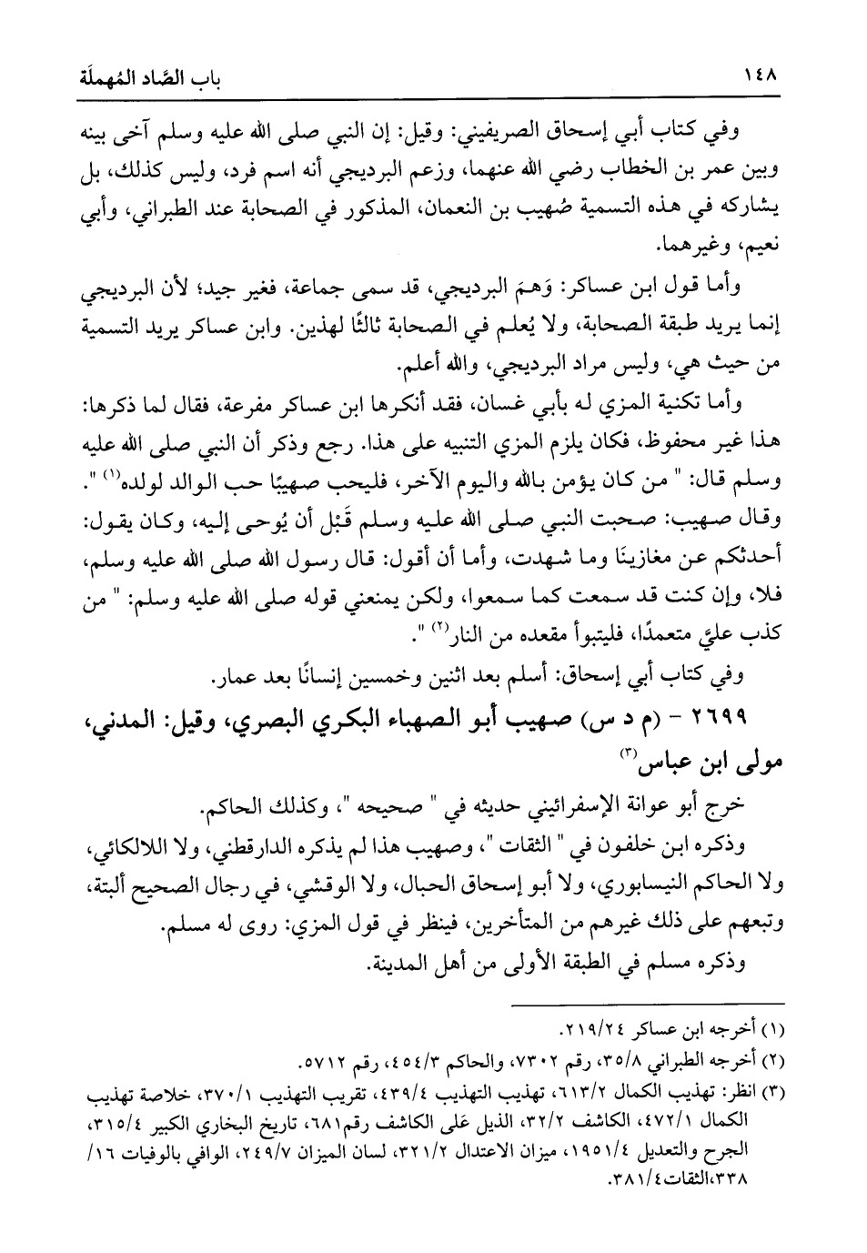 وأما تكنية المزي له بأبي غسان، فقد أنكرها ابن عساكر مفرعة، فقال لما ذكرها: هذا غير محفوظ، فكان يلزم المزي التنبيه على هذا. رجع وذكر أن النبي صلى اللَّه عليه وسلم قال: "من كان يؤمن باللَّه واليوم الآخر، فليحب صهيبًا حب الوالد لولده (¬١) ". وقال صهيب: صحبت النبي صلى اللَّه عليه وسلم قَبْل أن يُوحى إليه، وكان يقول: أحدثكم عن مغازينَا وما شهدت، وأما أن أقول: قال رسول اللَّه صلى اللَّه عليه وسلم، فلا، وإن كنت قد سمعت كما سمعوا، ولكن يمنعني قوله صلى اللَّه عليه وسلم: "من كذب عليَّ متعمدًا، فليتبوأ مقعده من النار (¬٢) ".