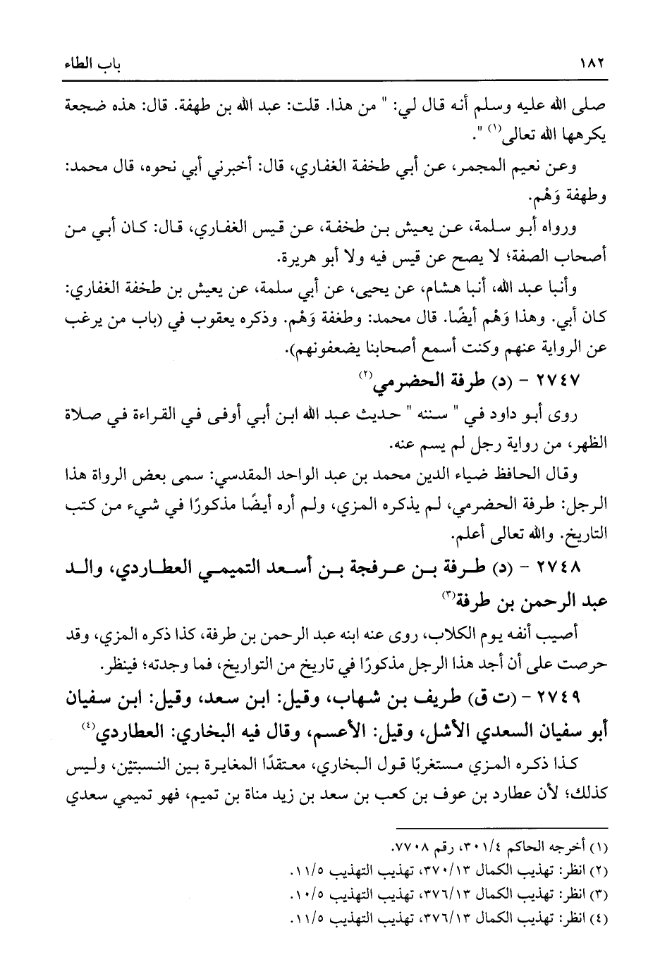 وقال الحافظ ضياء الدين محمد بن عبد الواحد المقدسي: سمى بعض الرواة هذا الرجل: طرفة الحضرمي، لم يذكره المزي، ولم أره أيضًا مذكورًا في شيء من كتب التاريخ. واللَّه تعالى أعلم.