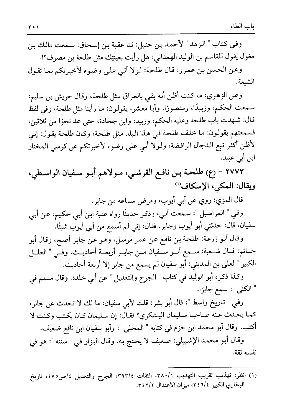 وفي كتاب "الزهد" لأحمد بن حنبل: ثنا عقبة بن إسحاق: سمعت مالك بن مغول يقول للقاسم بن الوليد الهمداني: هل رأيت بعينيْك مثل طلحة بن مصرف؟ ! .